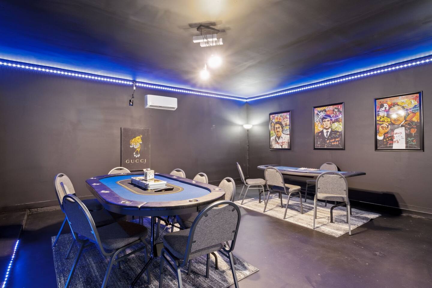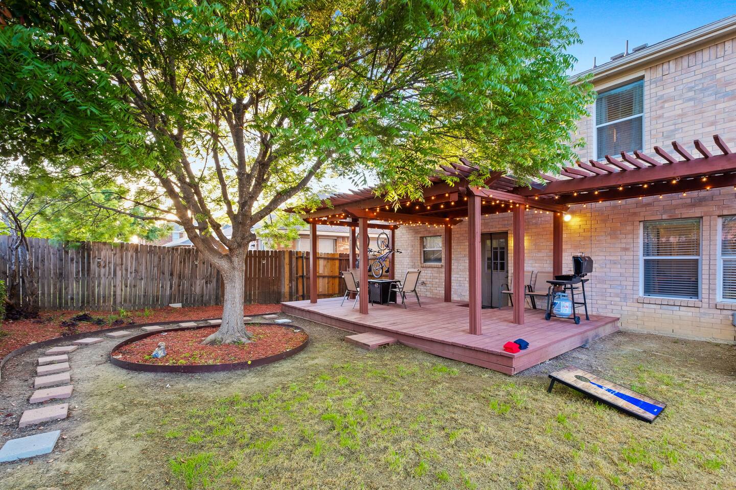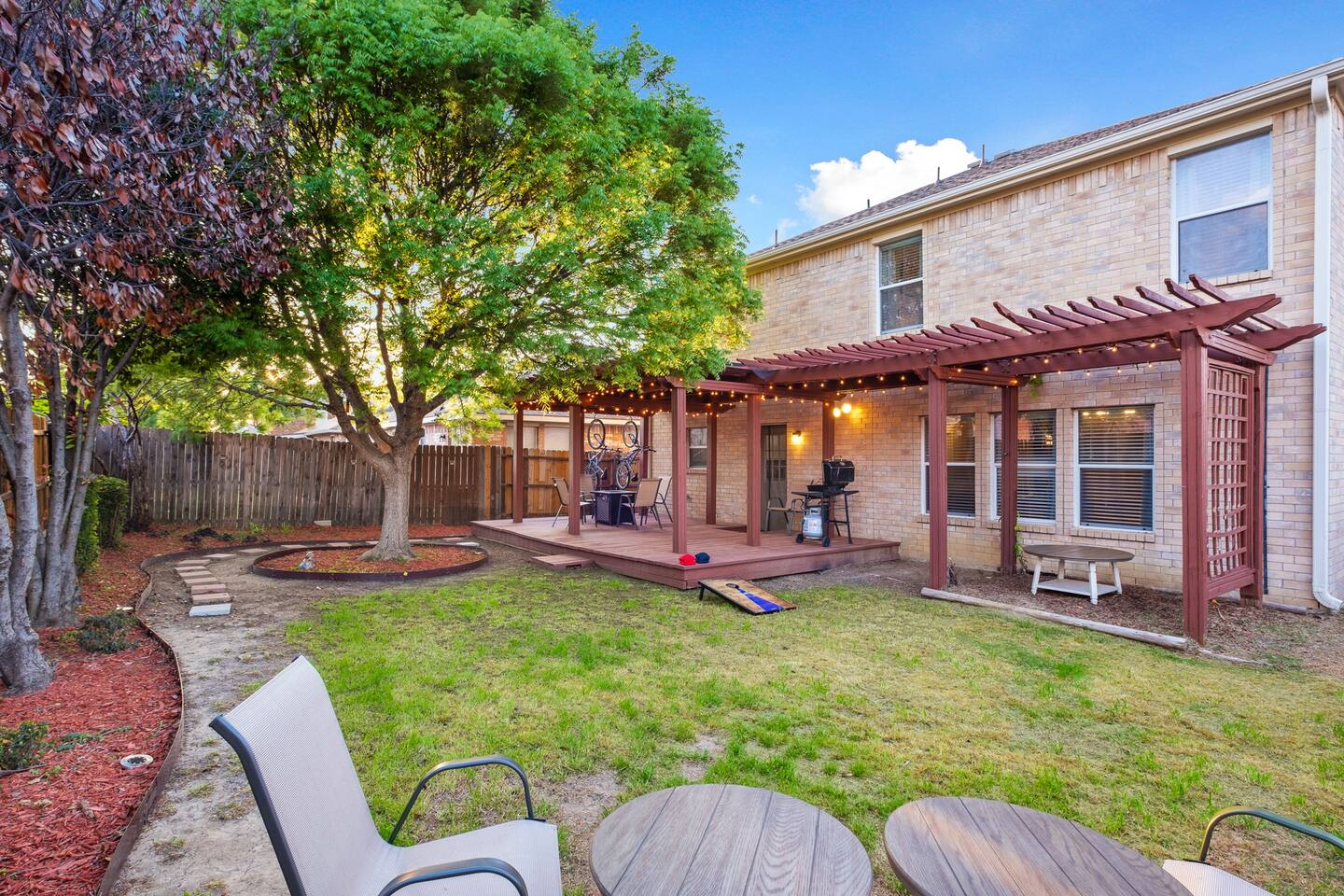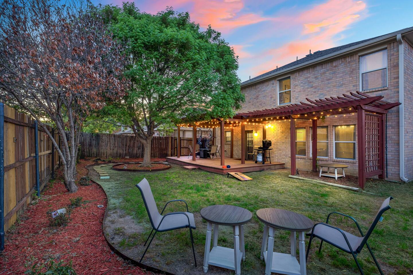 Entire Luxurious Epic Home in Grand Prairie, just outside of Dallas. This Luxurious 3,000 sq ft home comes with numerous amenities: ✔ Master bedroom with a KING size bed ✔ Game Room for the adults (Poker table and Blackjack Table) ✔ Game room for the kids (Xbox, Interactive dartboard) ✔ Outside Patio for family/group gatherings ✔ Luxury Pool table ✔ 6 separate Smart TVs ✔ Washer and Dryer on site ✔ Master bathroom with a hot tub (perfect for couples) ✔ Equipped with a BBQ ✔ Outdoor fireplace ✔ Bicycles to ride to a nearby pond park ✔ Located near a lake ✔ Social Media props ✔ Fully loaded kitchen with a smart refrigerator ✔ Backyard for outdoor activities ✔ Located near restaurants, shopping centers, and entertainment centers ✔ 15 min away from the AT&T Cowboys Stadium ✔ Close to the EPIC, Six Flags, and DFW Airport Located in a great quiet neighborhood! Minutes away from all the best dinner spots, shopping centers, parks, lakes, and coffee shops! The space: The spacious kitchen is fully equipped with many amenities and a separate glass breakfast table adjacent to a very spacious living room. A generous size dining area is intimately designed to enjoy quality time with your loved ones. Included in the dining area is the Happy Hour corner with social games – perfect for a fun time for groups. A spacious living room was specifically designed for people to relax and enjoy time with their loved ones. A roomy and very comfortable sectional is big enough to bring everyone together for a fun movie night. The living room is also decorated with a LED light prop wall – perfect to make a social media statement and create long-lasting memories. Plenty of natural light comes through the large windows, making the home very bright during the day, and enhancing the luxurious ambiance. A large backyard comes with an outdoor patio, big enough to enjoy the great outdoors. The outdoor fireplace brings everyone together and creates a chill vibe. LED lights turn on at night, giving the backyard just enough light to enjoy the scenery. The patio is covered with hanging lights which creates an atmosphere of being in your own backyard at home. It also comes with a BBQ grill to cook up those perfect steaks. Retreat to four comfortable bedrooms, which feature 5☆-resort comforts that allow you to rest after an exciting day of DFW adventures. ★ LIVING ROOM ★ It immediately feels like home! Find your place on the comfy sofa, cuddle up with a good book, watch a movie, or discuss your plans for the day. ✔ Comfortable Large 12x10ft sectional is big enough to fit the entire family ✔ 65” Smart TV with Streaming services and a sound system ✔ Coffee Table with a 3D Ticktack Toe game ✔ Two additional sofa chairs to relax on ★ KITCHEN & DINING ★ It is fully equipped with modern cooking appliances that make it suitable for preparing any meal, whether a simple breakfast, a quick snack, or a three-course gourmet dinner. There is plenty of room in this kitchen to prepare large feasts. The amenities include: ✔ Microwave ✔ Stove ✔ Toaster ✔ Drip Coffee Maker ✔ Smart Refrigerator/Freezer ✔ Dishwasher ✔ Blender ✔ Tea kettle ✔ Cooking/baking supplies ✔ Sink - Hot & Cold Water ✔ Glasses ✔ Silverware ✔ Pots & Pans ✔ Garbage Disposal Have a few drinks on the outdoor patio by the fireplace while the food is getting ready. Once it's done, serve it on the dining table and enjoy a tasty meal with your loved ones. Breakfasts, snacks, and smaller meals can easily be served on the glass breakfast table conveniently located in the kitchen area. ✔ Dining Table comfortably seats up to 12 people ✔ Happy Hour corner for the adults ✔ Social games to keep everyone engaged ★ SLEEPING ARRANGEMENTS – 4 BEDROOMS ★ After an exciting day of adventures, you will be looking to rest for an equally entertaining tomorrow. Once you are ready to relax, please make your way to these comfortable bedrooms. ♛ Master Bedroom: King-Size Bed, Smart TV, Work Desk, Dresser, Walk-in Closet, Master Bathroom with a Hot Tub ♛ Bedroom 2: Queen-Size Beds with a Closet, Dresser, Smart TV, and Work Desk ♛ Bedroom 3: Two Queen-Size Bed, Closet, and Dresser ♛ Bedroom 4: Queen-Size Bed, Smart TV, and Dreser ♛ Additional Beds: Queen-Size Pull-out sofa & Luxury Queen-size Airbed All bedrooms are equipped with a similar set of amenities. ✔ Premium Pillows, Linens, and Sheets ✔ Mirrors ✔ Night Stands ★ BATHROOMS ★ Besides the ensuite bathroom of the master bedroom, the house features one more full relaxing bathroom, and one more half bathroom. Both are stocked with fresh towels and essential toiletries to ensure you have a carefree stay. ✔ Mirror ✔ Toilet ✔ Towels ✔ Hair Dryer ✔ Essential Toiletries ★ THE LOFT★ A perfect place for fun and competitive times. The loft is made to have a fun family experience while remaining at home. Sharpen your competitive skills with ✔Luxury Pool Table ✔ Multi-player Xbox games ✔ Interactive Dartboard game Parents, be advised that the hanging wall should not be used by children without an adult supervision. ★ GAME ROOM★ “Big kids” Casino game room with its own separate AC/Heater Unit is perfect to relax your mind and have a great time with the rest of the adults at the house. Treat yourself to a fun game of Poker or Blackjack. Or simply enjoy the Smart TV or music in in the ambient atmosphere. Use the LED lights remote to give the Game Room any vibe you want. ★ BACKYARD ★ A fantastic home like this would not shine in its best light if it did not have a private, fenced area where you can relax and enjoy the mesmerizing natural surroundings. Step out into the fully fenced backyard with a covered patio covered with lights. Bring your family together around the fireplace and enjoy some private time. ✔ Outdoor Seating/Dining ✔ Game of Corn Hole ✔ Two bicycles to take for a ride around the block or to a nea
