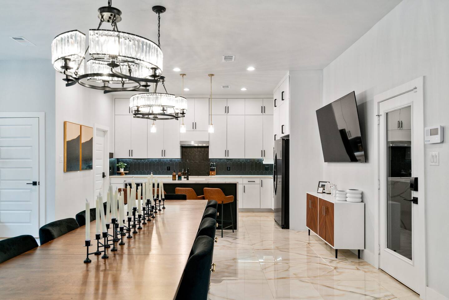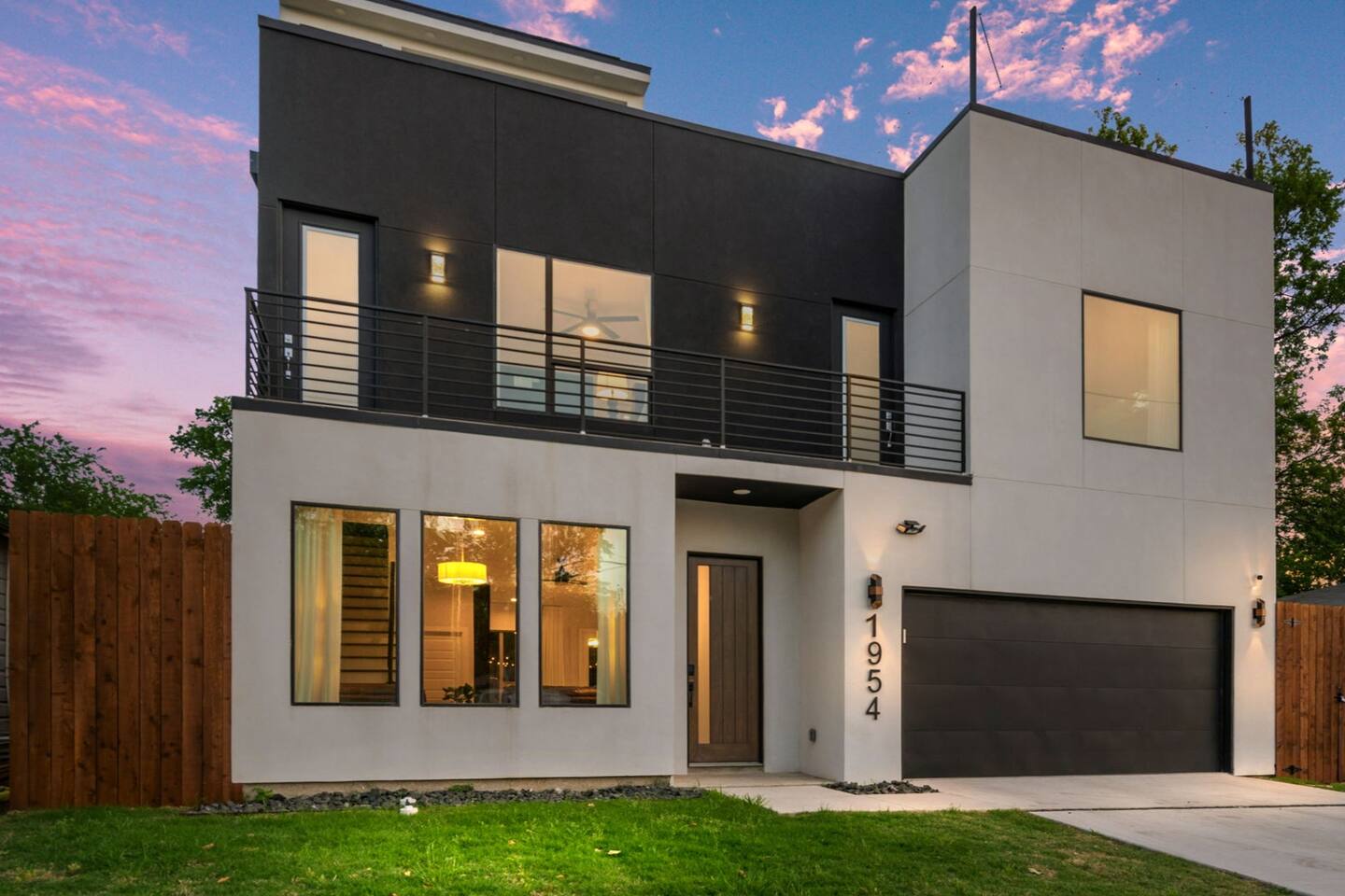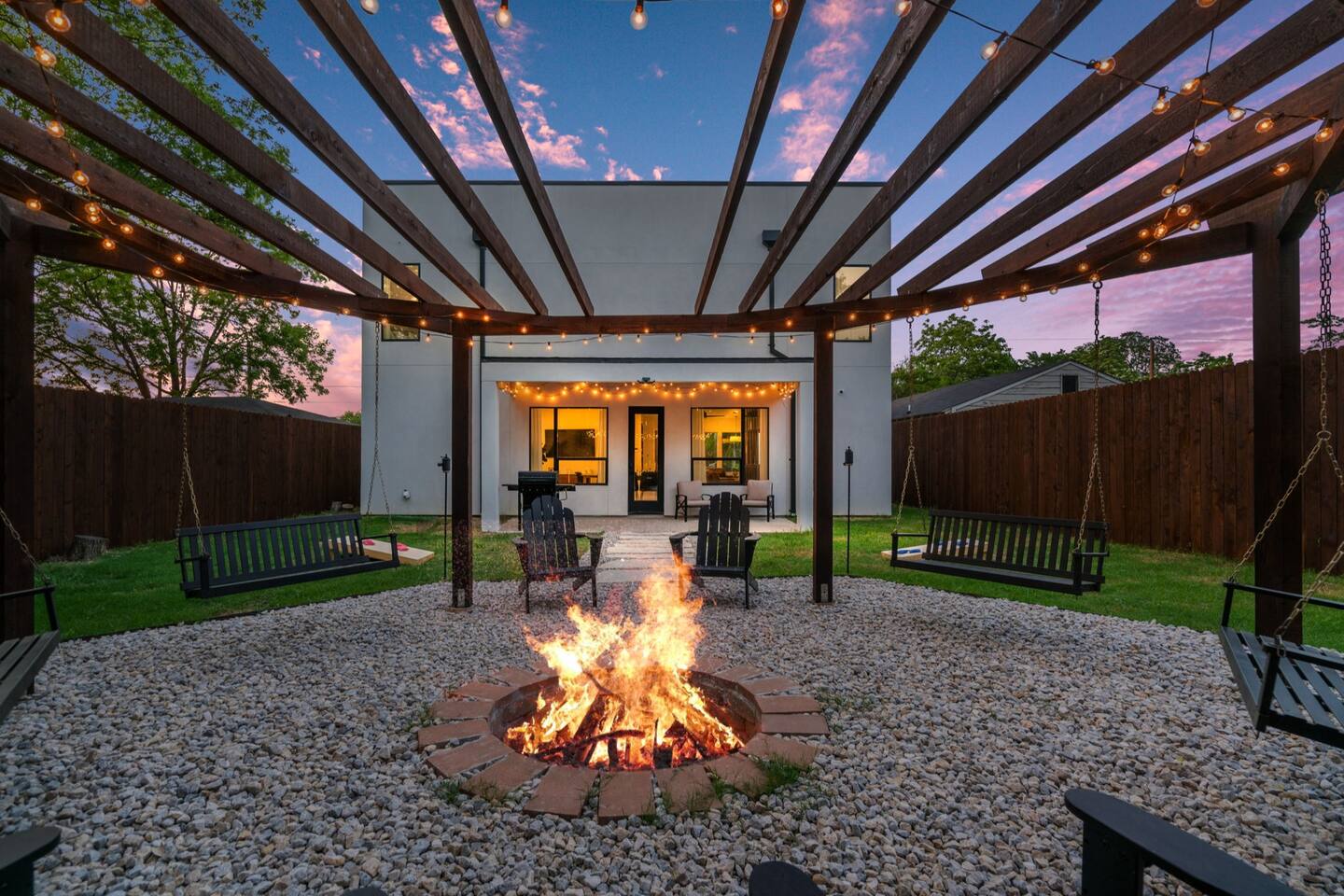For you next modern getaway trip, this home is ready for you! Right as you enter, you are greeted by the spacious and airy open floor plan featured throughout the first floor! The downstairs lounge area features 2 oversized leather love seats, great for curling up in with a good book! The picture perfect living room features a luxurious leather sofa with beautiful built-in white shelf detailing that ties it all together. The elegant dining space features 2 stunning chandeliers as well as a massive dining table that seats up to 10 comfortably! The candle centerpiece is a show stopper and is a great decoration base for your next dinner party! Grab your friends and family and watch the big game on the smart TV featured in the dining space! Watch the game from the comfort of your seat and you chow down! The full size kitchen features a beautiful black tile backsplash that really catches your eye from every angle and is mesmerizing! With plenty of counter space and provided equipment, you won't feel limited in this kitchen! The full range glass stove-top and oven allow you to make all your favorite home cooked meals! Take advantage of the oversized kitchen island that provides 4 additional dining seats! For all the caffeine lovers, the provided coffee station is great to start your day of with! Located downstairs is also the laundry room that features a full size washer and dryer for your convenience as well as a half-bath near the kitchen! Located upstairs is all of the bedrooms! The master bedroom features an oh so plush king size bed fit for royalty! The custom built black textured accent wall makes this room feel luxurious along with the wall mounted lamps! The master BR also has an attached master bath that features a massive walk-in shower as well as double sinks that make it convenient for multiple people to get ready! Get a good night's rest in the second BR that has 2 queen beds and a attached bath with a walk-in shower! The 3rd and 4th BR both have 2 queen beds and each have a designated work space for working travelers! The 3rd full bath features both a walk-in shower as well as a modern garden style separate tub that is so spacious and deep! Pamper yourself after a long day of exploring all Dallas has to offer in the bath tub! Upstairs has direct access to the rooftop patio that gives you the ultimate view of the Dallas skyline! With two seating areas, a big smart TV, and a gas fire pit, this rooftop has it all! Featuring plenty of at-home entertainment, you'll have a great time in your home away from home! The backyard itself has a custom built pergola with swings and a wood-fire pit!