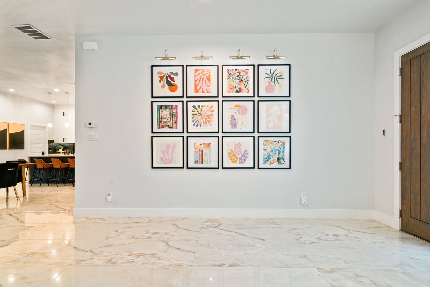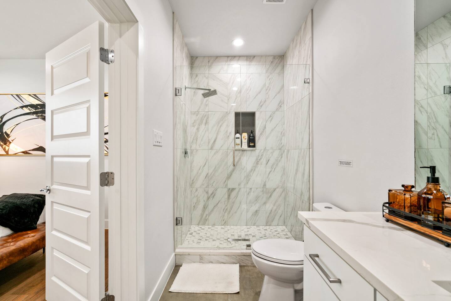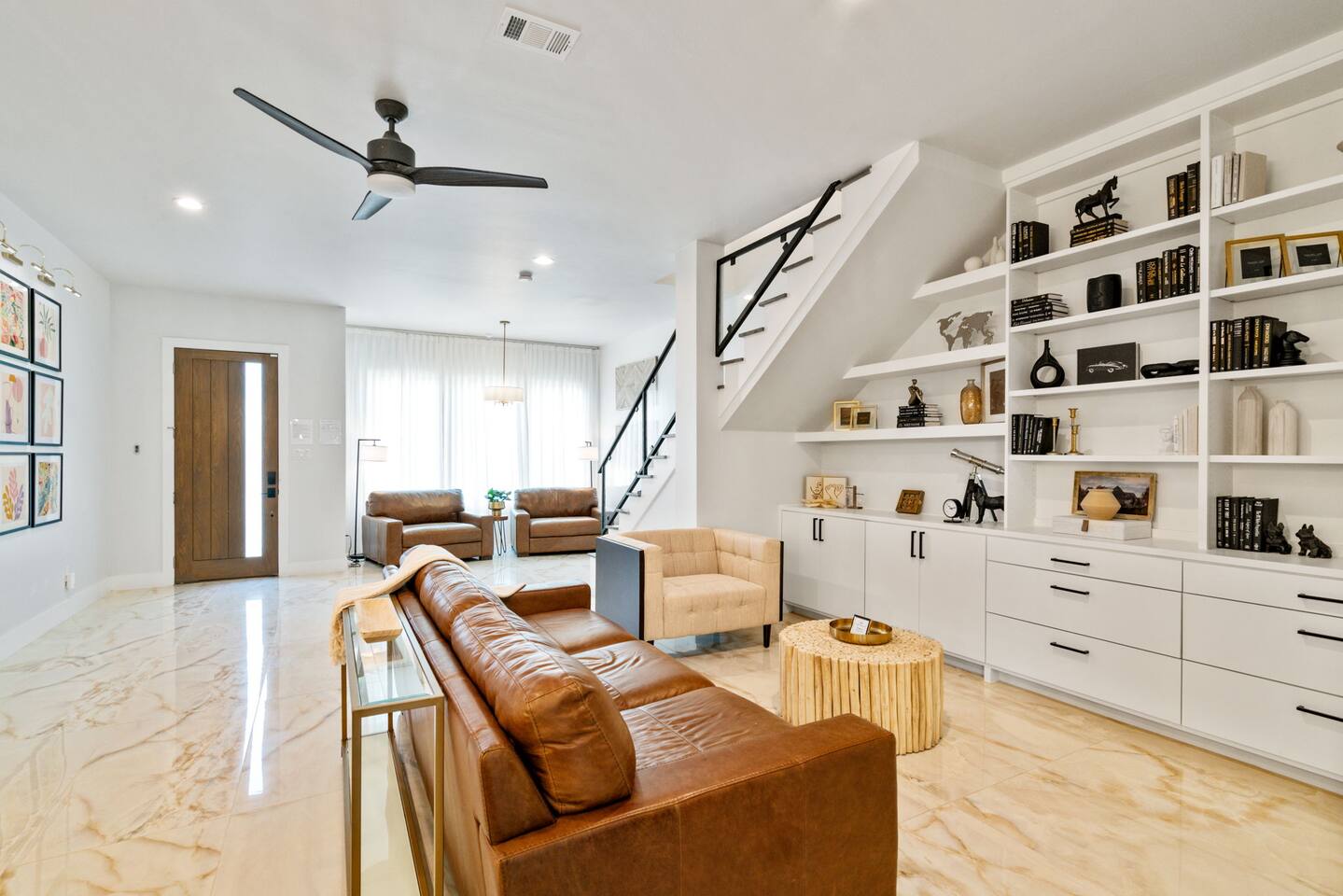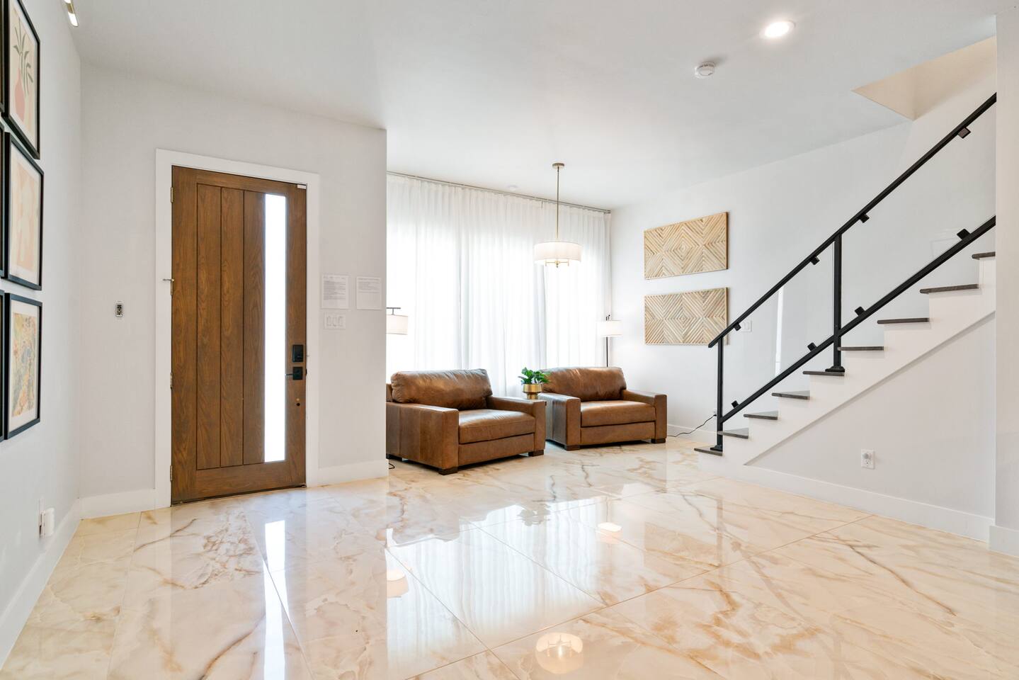 For you next modern getaway trip, this home is ready for you! Right as you enter, you are greeted by the spacious and airy open floor plan featured throughout the first floor! The downstairs lounge area features 2 oversized leather love seats, great for curling up in with a good book! The picture perfect living room features a luxurious leather sofa with beautiful built-in white shelf detailing that ties it all together. The elegant dining space features 2 stunning chandeliers as well as a massive dining table that seats up to 10 comfortably! The candle centerpiece is a show stopper and is a great decoration base for your next dinner party! Grab your friends and family and watch the big game on the smart TV featured in the dining space! Watch the game from the comfort of your seat and you chow down! The full size kitchen features a beautiful black tile backsplash that really catches your eye from every angle and is mesmerizing! With plenty of counter space and provided equipment, you won't feel limited in this kitchen! The full range glass stove-top and oven allow you to make all your favorite home cooked meals! Take advantage of the oversized kitchen island that provides 4 additional dining seats! For all the caffeine lovers, the provided coffee station is great to start your day of with! Located downstairs is also the laundry room that features a full size washer and dryer for your convenience as well as a half-bath near the kitchen! Located upstairs is all of the bedrooms! The master bedroom features an oh so plush king size bed fit for royalty! The custom built black textured accent wall makes this room feel luxurious along with the wall mounted lamps! The master BR also has an attached master bath that features a massive walk-in shower as well as double sinks that make it convenient for multiple people to get ready! Get a good night's rest in the second BR that has 2 queen beds and a attached bath with a walk-in shower! The 3rd and 4th BR both have 2 queen beds and each have a designated work space for working travelers! The 3rd full bath features both a walk-in shower as well as a modern garden style separate tub that is so spacious and deep! Pamper yourself after a long day of exploring all Dallas has to offer in the bath tub! Upstairs has direct access to the rooftop patio that gives you the ultimate view of the Dallas skyline! With two seating areas, a big smart TV, and a gas fire pit, this rooftop has it all! Featuring plenty of at-home entertainment, you'll have a great time in your home away from home! The backyard itself has a custom built pergola with swings and a wood-fire pit!