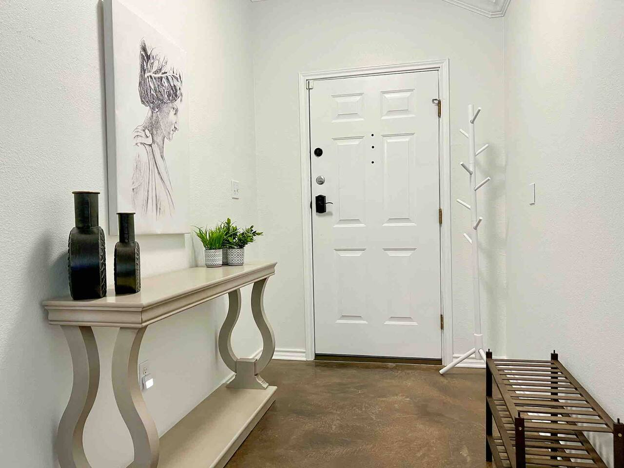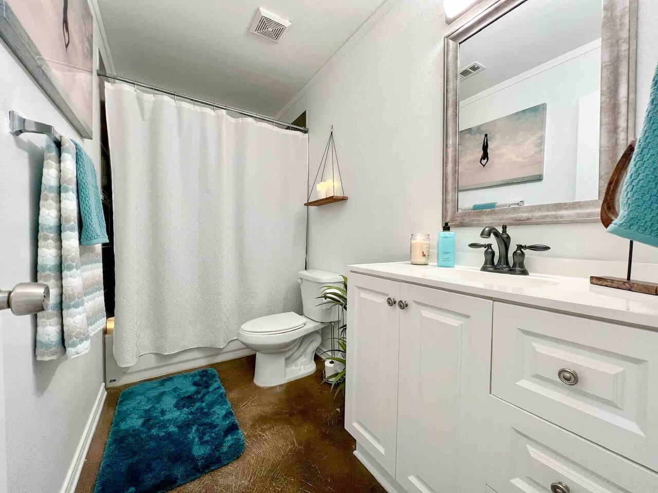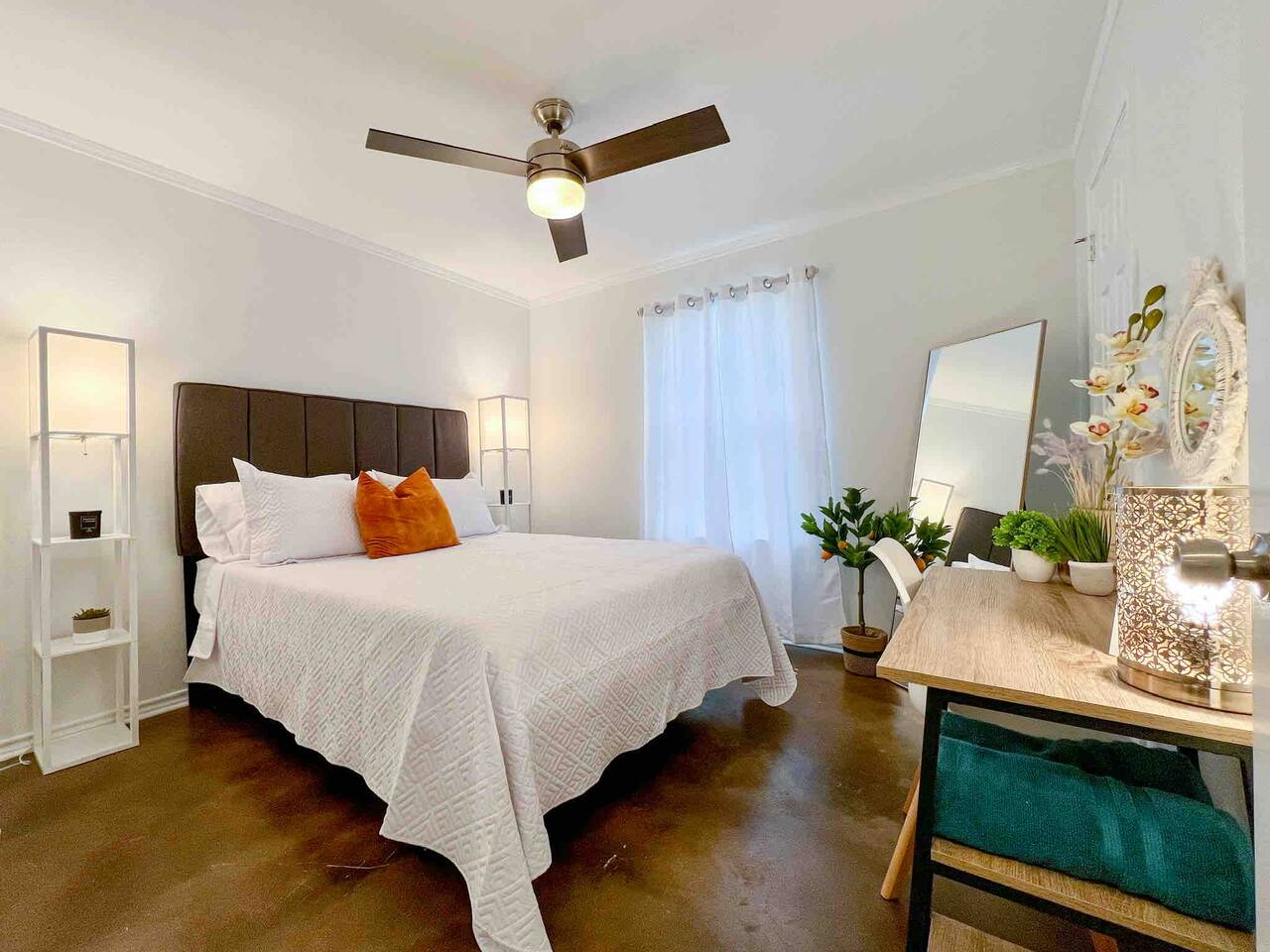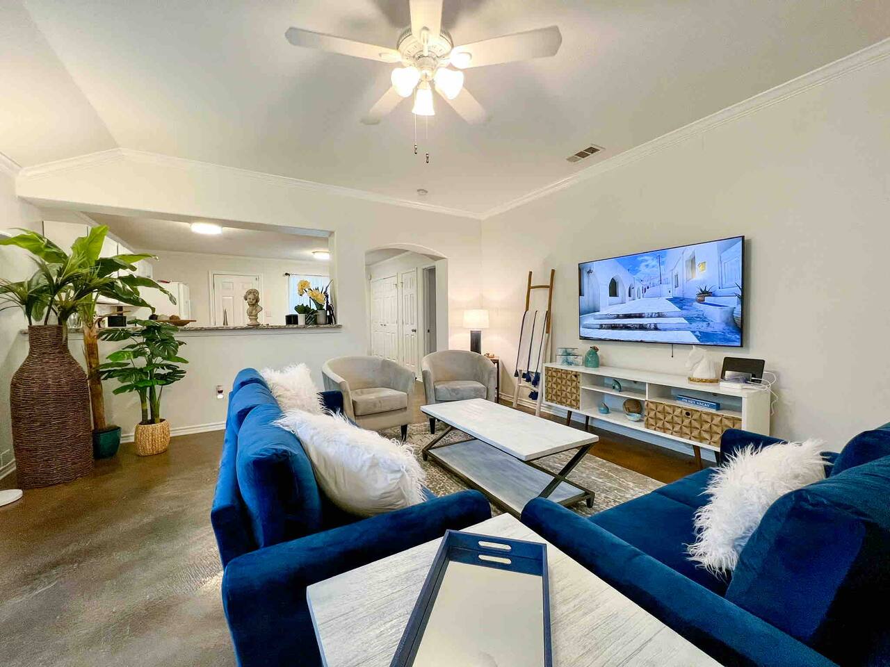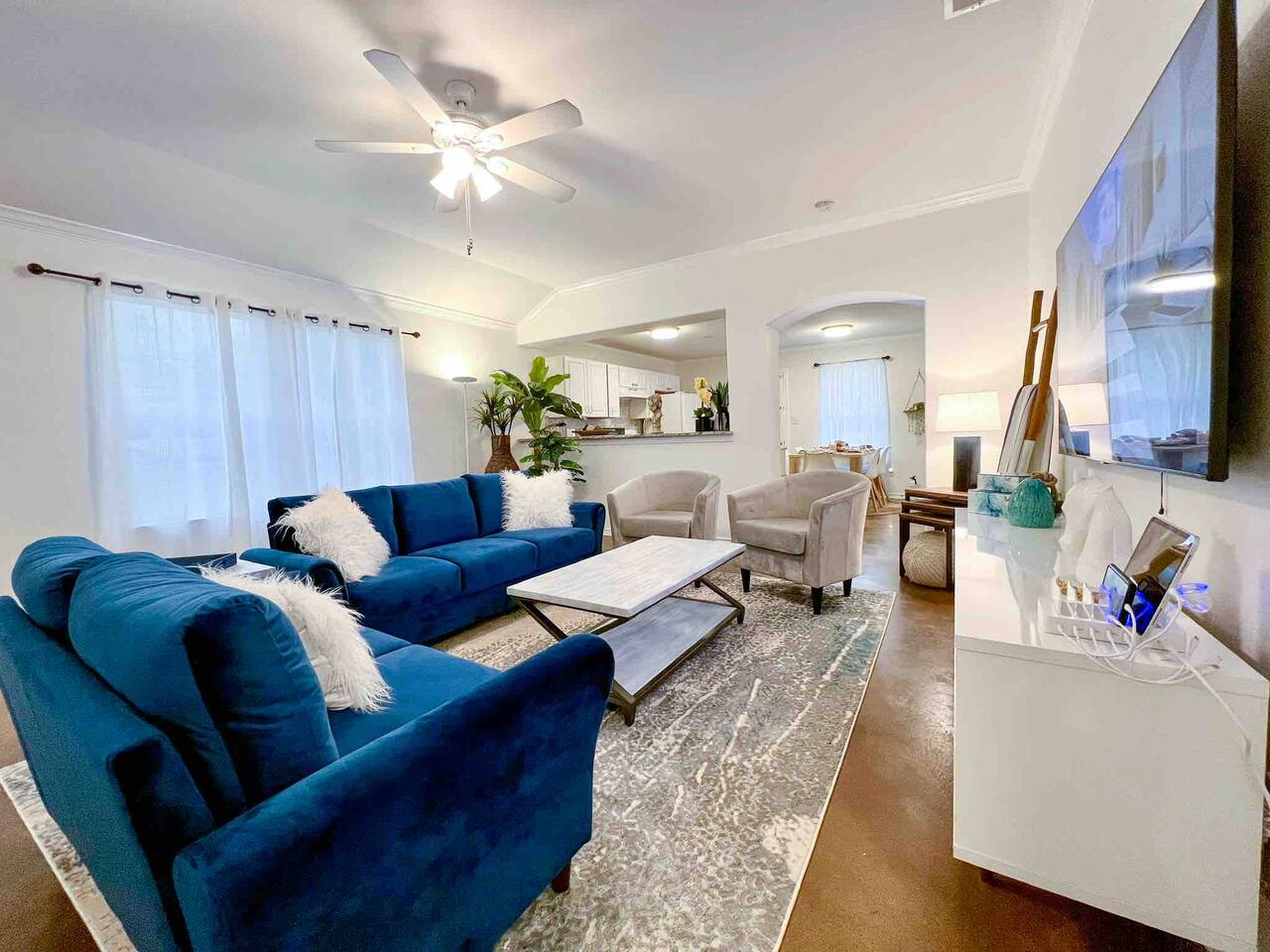 This bright new feeling home has an open floor plan only separated by the kitchen bar top. The kitchen comes fully equipped to live here for an extended amount of time. In the backyard you will find a self watering system and landscaping lights that keep the backyard alive and tranquil. The large table can host a large group that is great for grill outs. Also there is a chiminea corner if you need some alone time and relax. Each of the rooms have a quality queen mattress so you are able to get quality sleep. Also two of the bedrooms have brand new Samsung smart TVs. Three of the bedrooms have workstations so you can have a private place to put your laptop. One of the main rooms even has an Ethernet connection for guests that need an extra kick in their internet connection. One of the bedrooms has an attacked bathroom while the other bathroom is for the other three bedrooms to share.