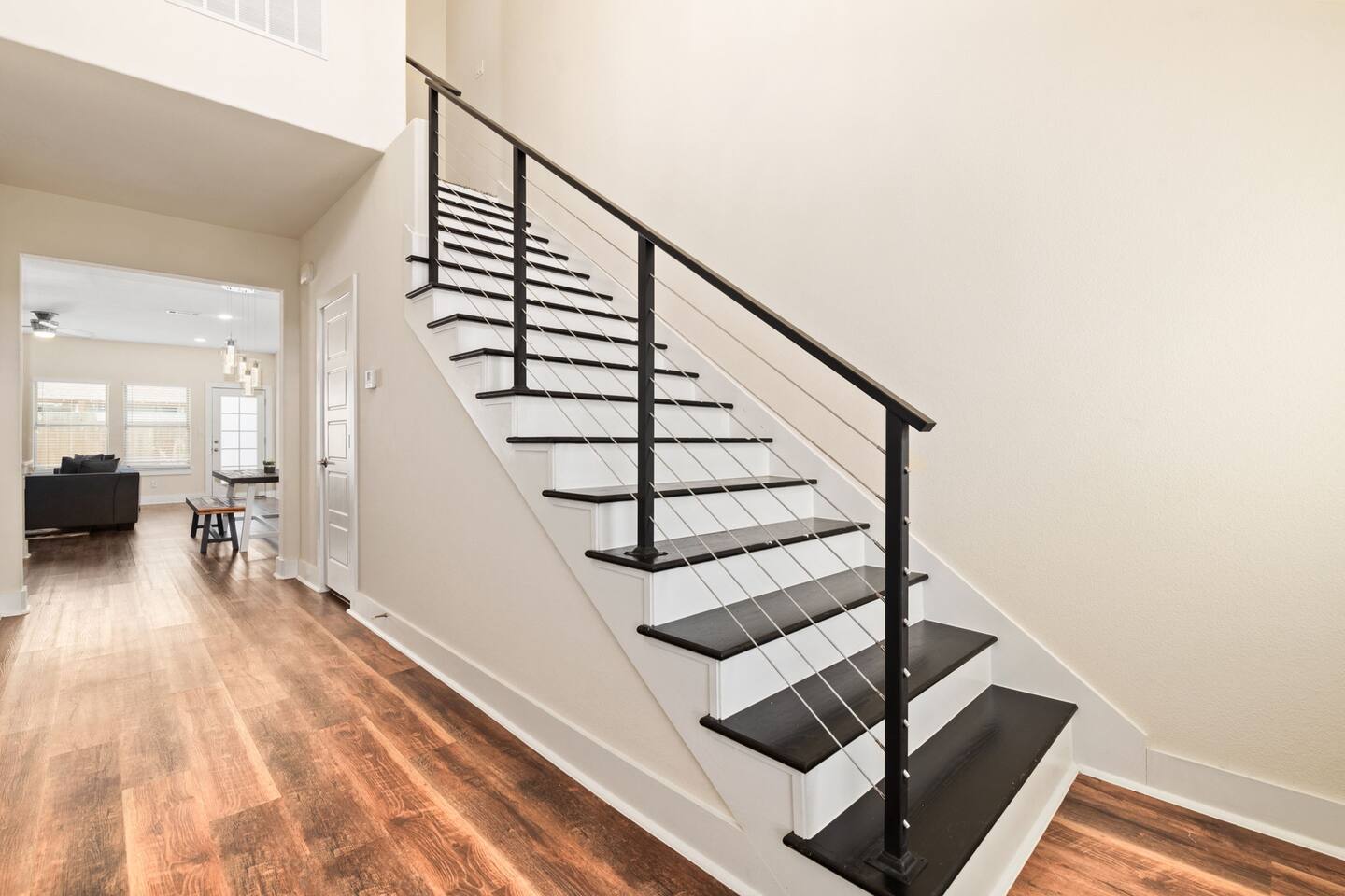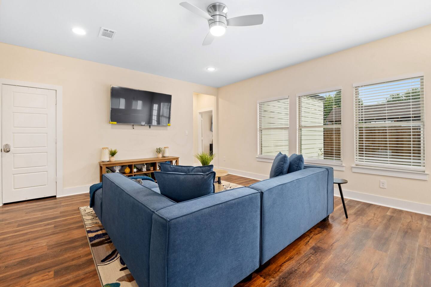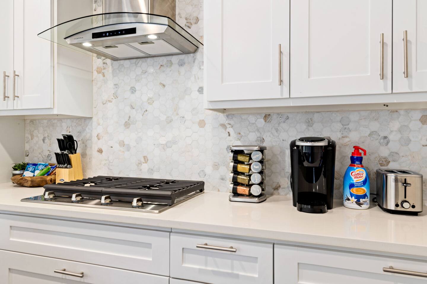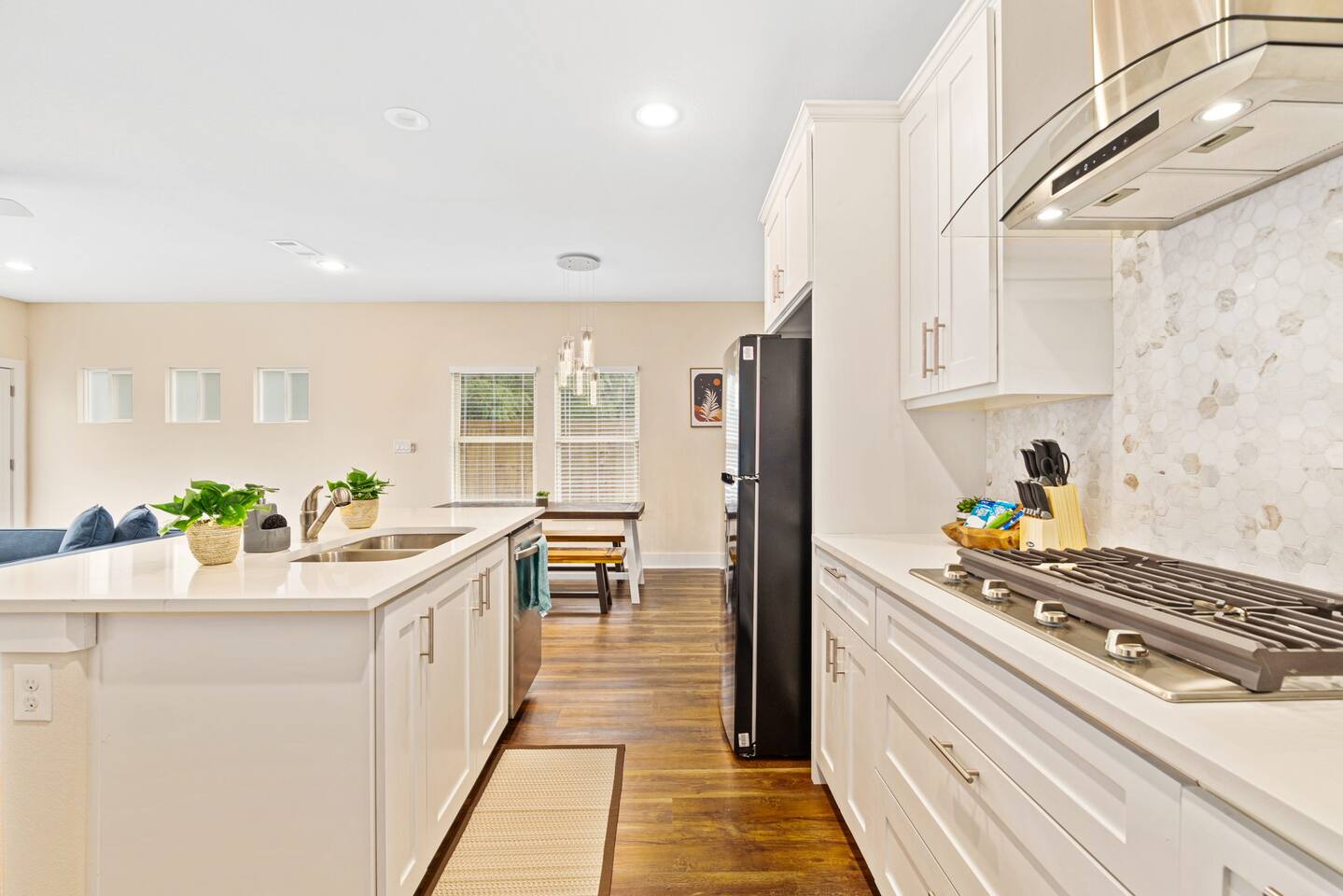 Beautiful and bright, this home features plenty of natural light throughout creating a warm atmosphere for you to enjoy! As you enter, you are greeted by the stairs that lead to your comfy bedrooms and the open concept layout featured downstairs! The open concept allows the dining, living, and kitchen to flow together to create a welcoming common space. The full size kitchen features every at-home chefs dream, a full range gas stove! The kitchen also features basic seasonings, oils, and dishware for your convenience. Take advantage of the provided coffee station and start your day off right with a cup of joe! The oversized kitchen island provides plenty of cooking space to prepare a big feast! Serve up your homemade food on the bench style dining table that seats 6! As you move onto the living room, take a seat on the comfy sectional while watching TV on the big smart flatscreen! Located downstairs is the master bedroom that features an ultra plush king size bed as well as a big smart TV! Enjoy your favorite shows from the comfort of your bed! The attached master bathroom features double sinks that makes it convenient for multiple people to get ready at once! Relax in the spacious and luxurious walk-in shower! Located upstairs is the second bedroom that can accommodate plenty of guests with its two queen size beds! The third bedroom features two queen size beds. Catch up on your sleep in the fourth bedroom that has an oh so comfy queen bed and a plush full size bed. Unwind in the fifth bedrooms queen size bed! Pamper yourself in the upstairs bathroom that features a combination shower/tub!