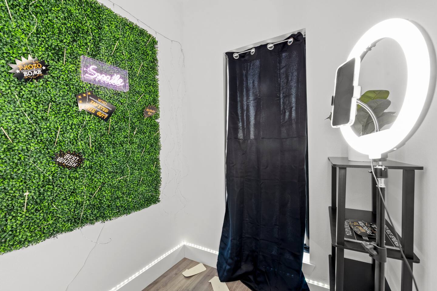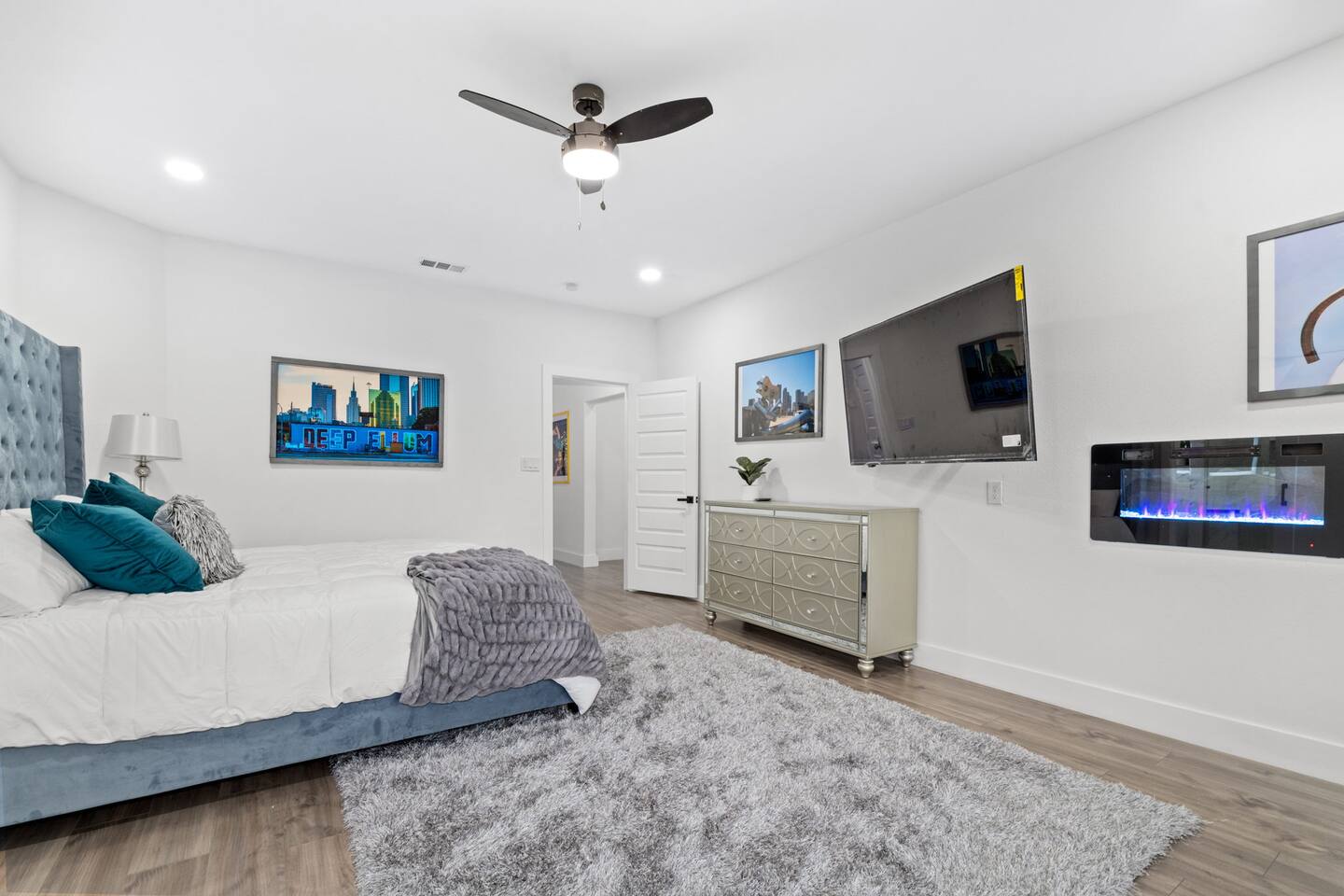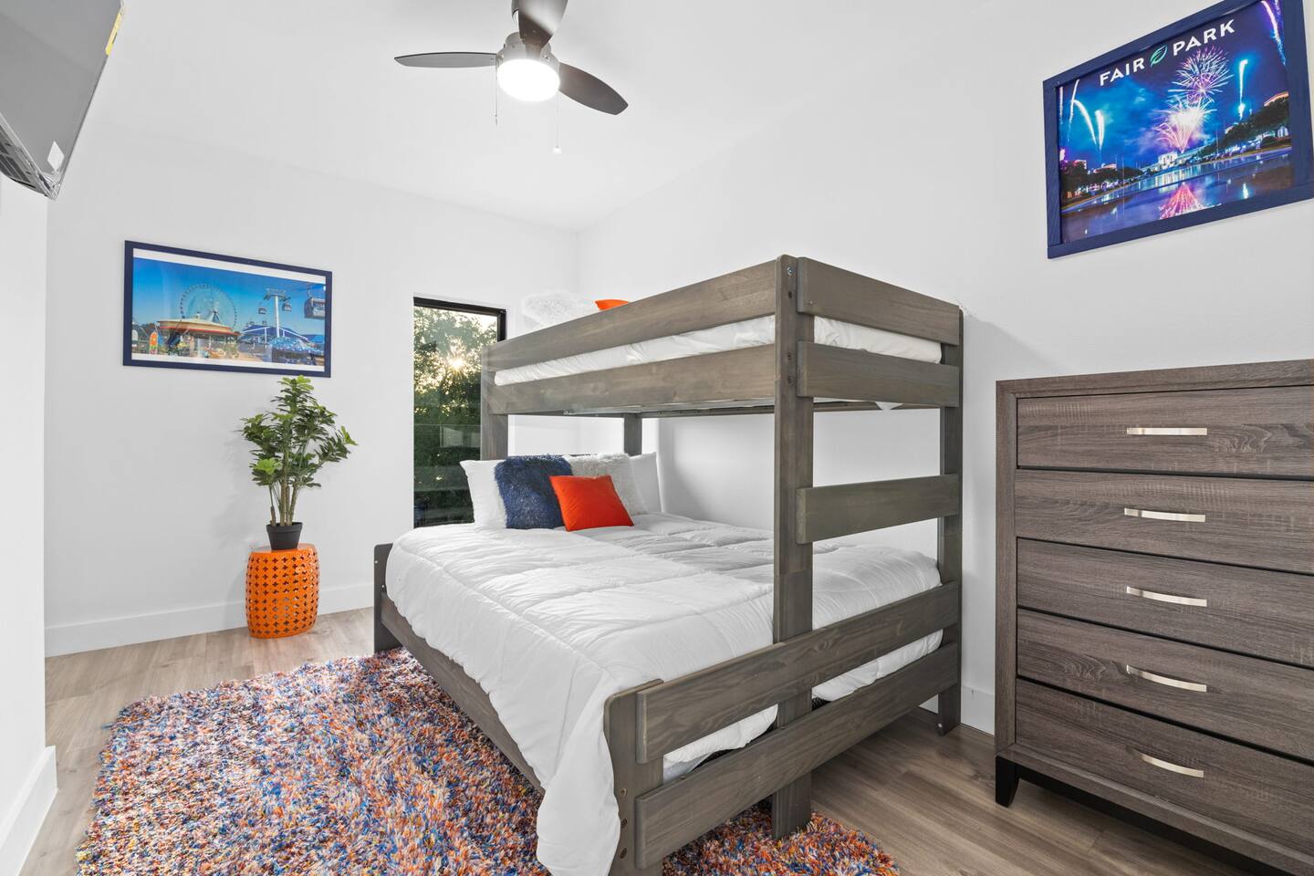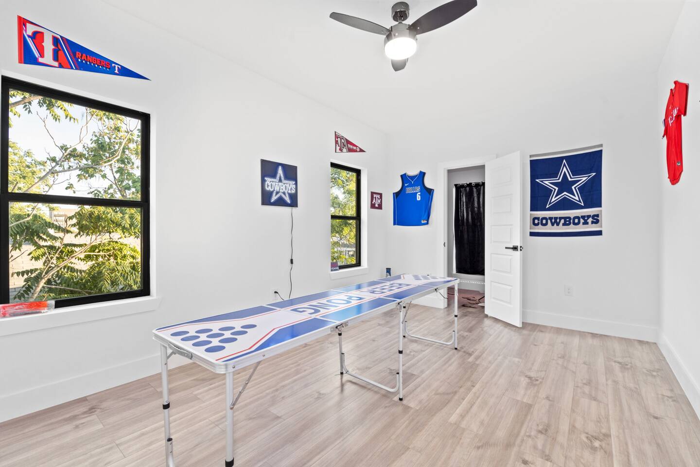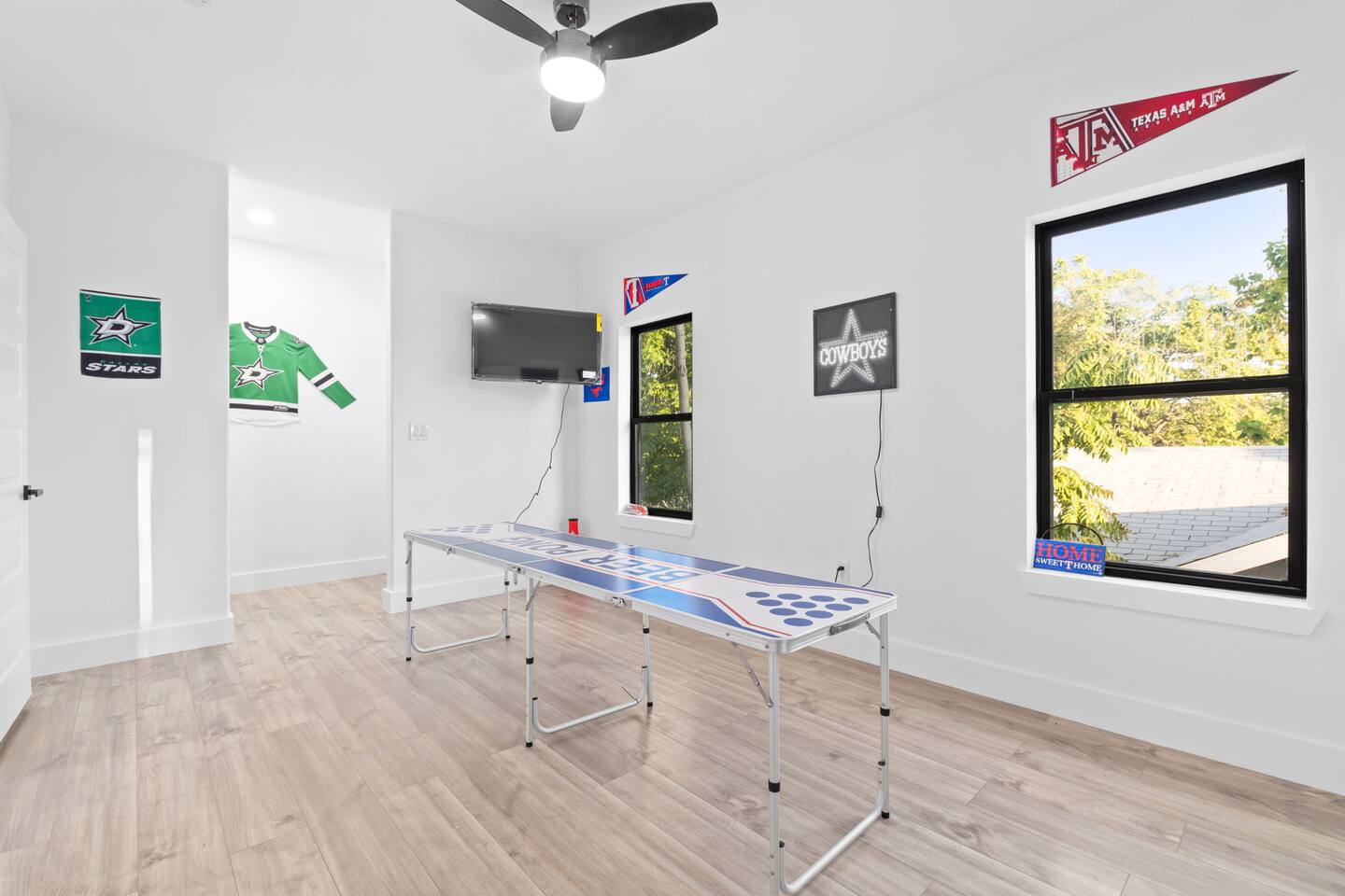 As you enter the home, you are greeted with plenty of natural sunlight that comes in through the big windows featured throughout. With an open concept layout, the living, kitchen, and dining area flow together to create a welcoming common space great to host guests! Unwind in our spacious living room that features a luxe velvet sectional and a big smart TV for all your entertainment needs! Cozy up by the electric fireplace and read a nice book while sitting in one of the comfy accent chairs! If you need to get work done while traveling, use our provided work-space located downstairs! Take advantage of our designated selfie area that has a picture perfect grass wall and provided ring-light for all your selfie needs! For all the at-home chefs, this full kitchen features all new appliances and is well-equipped with everything you could need to make a fabulous feast! Serve it up on the beautiful dining table that seats 6 or on the oversized kitchen island that seats an additional 4 people! Make your way upstairs to the master bedroom that features a luxurious and plush king size bed with a velvet headboard! Watch TV from the comfort of your bed or enjoy the sunrise from your own balcony! Pamper yourself in the attached master bathroom that has a spacious bathtub and separate spacious walk-in shower. The double sinks featured makes it convenient for two people to get ready at once. Store all your luggage in the roomy master closet. The second bedroom is great for privacy and features one plush bed and direct access to the backyard balcony. The third bedroom has a comfy full size bed as well as a TV! The fourth bedroom features two full size beds as well as a TV and can accommodate multiple people. The fifth bedroom has a full size bottom and twin size top bunk bed great for kids! Relax while watching your favorite movies on the provided smart TV! The second full bathroom features a walk-in shower and double sinks. If you’re looking for entertainment, you can find plenty throughout the home! We provide a designated gaming area and lounge with plenty of board games to choose from or feel free to use the beer pong table! Making your way to the backyard you will find a beautifully furnished patio great for enjoying the outdoors in! Or watch the sunset from the upstairs balcony!