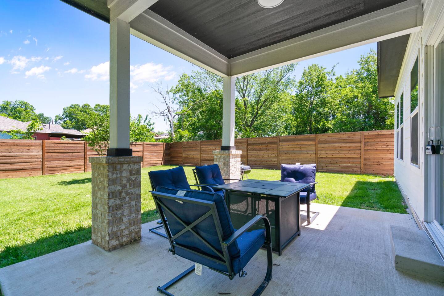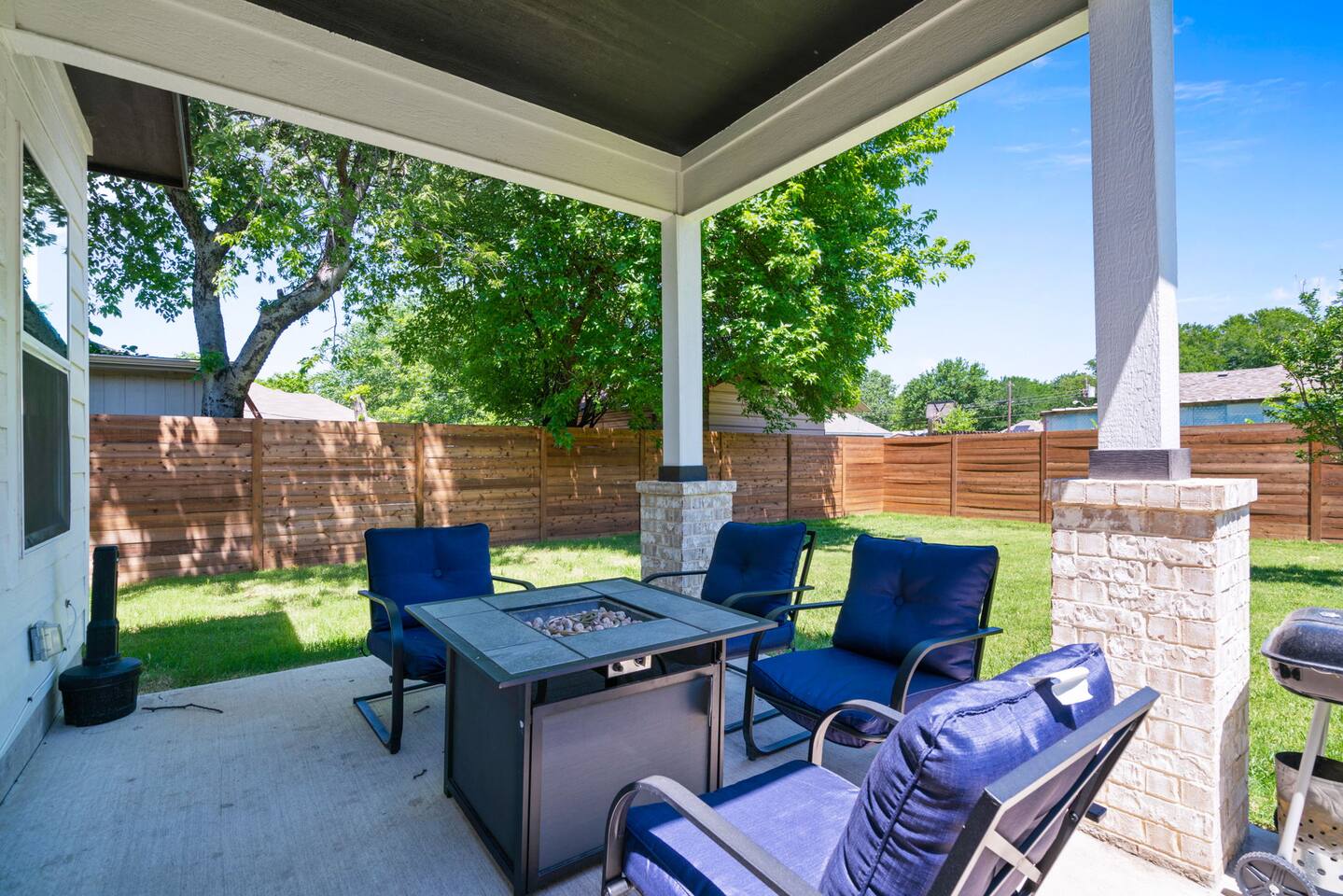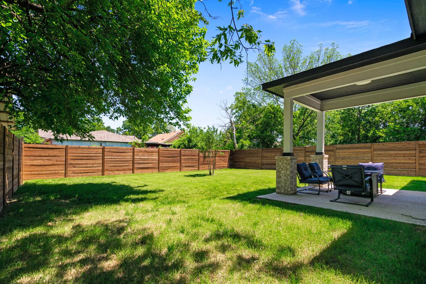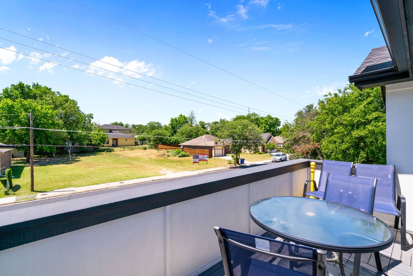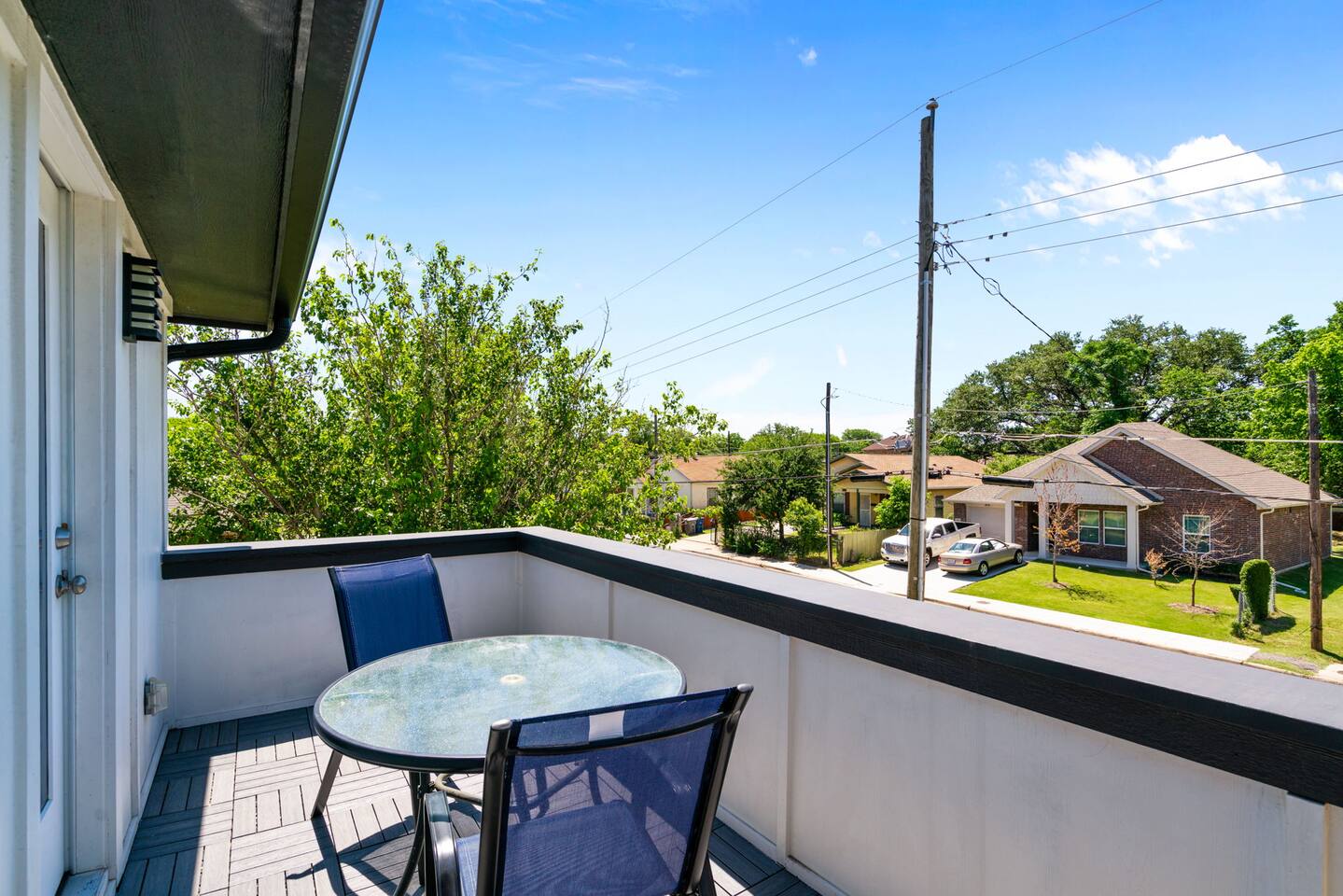 The beautiful open kitchen design lets you host large dinners more than comfortably as it is also fully stocked with everything you could need to cook big meals! Perfect for big groups, the massive dining table seats 10 along with the roomy kitchen island that seats 4. For caffeine lovers, the coffee station is complete with keurig pods as well as drip coffee for your use! Start or end your days with our fully stocked bright bathrooms that include all necessities and extras such as makeup remover wipes. Get restful nights with our comfy double/queen/king size beds. The living room couch is also a pull-out bed if more space is needed. The master bedroom features a luxurious king bed and mounted TV for all your watching needs! The master bathroom contains a stand-up shower but also a separate deep bathtub made to relax in after an eventful day. Watch the sunset outside in our second story balcony with a Dallas skyline view! The balcony is complete with a seating area to enjoy morning cups of coffee while watching the sunrise! The massive backyard features a patio seating area and plenty of room to entertain your guests, bring some picnic blankets and bask in the warm sun!