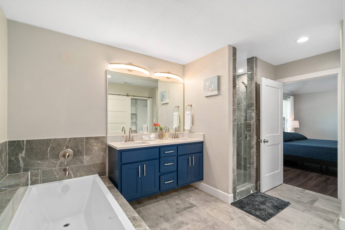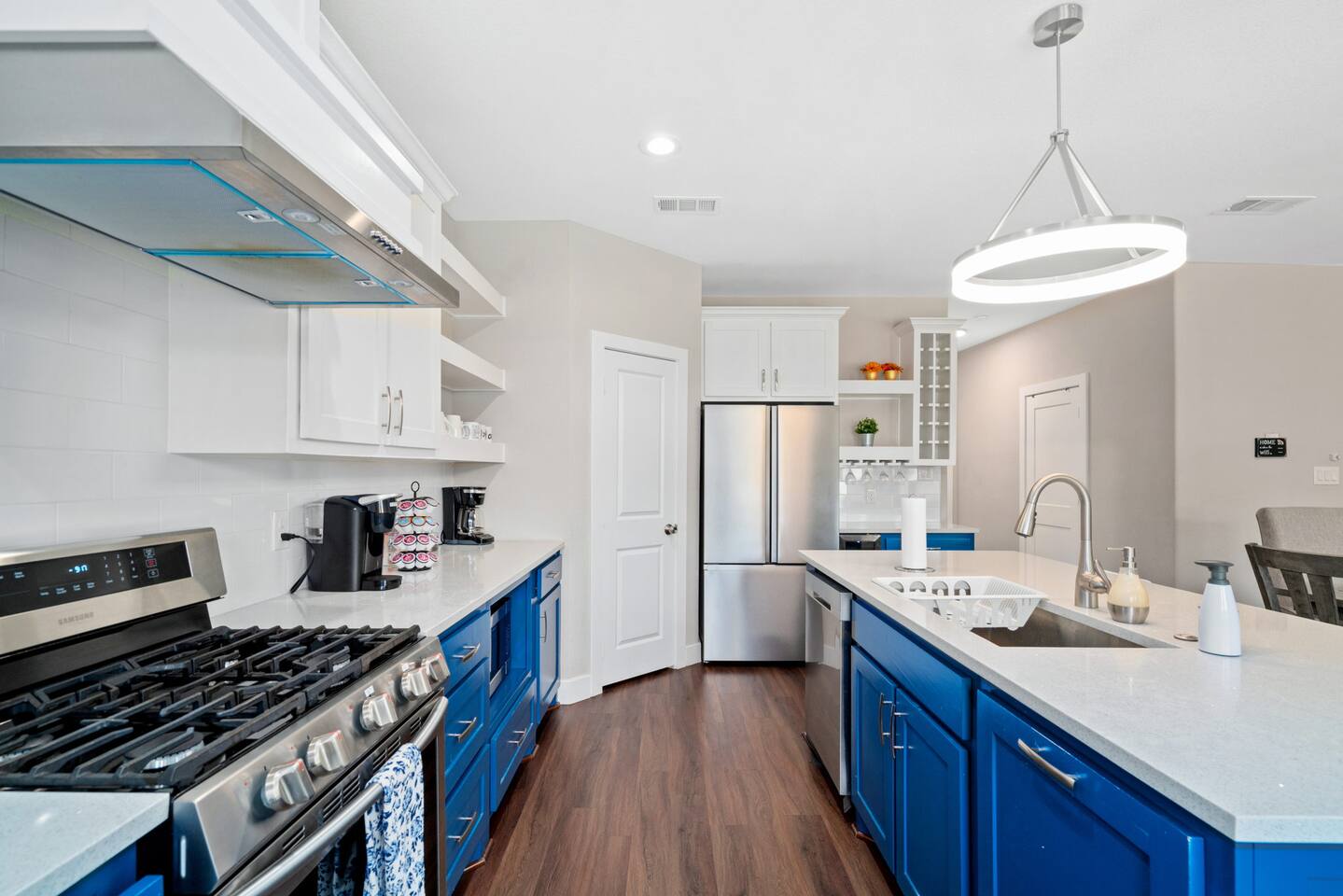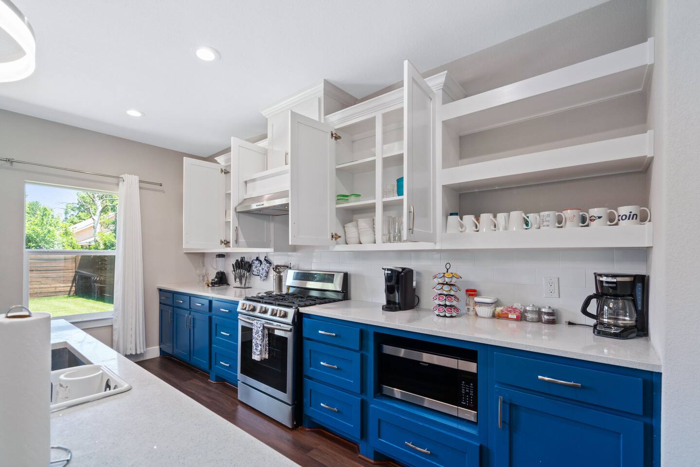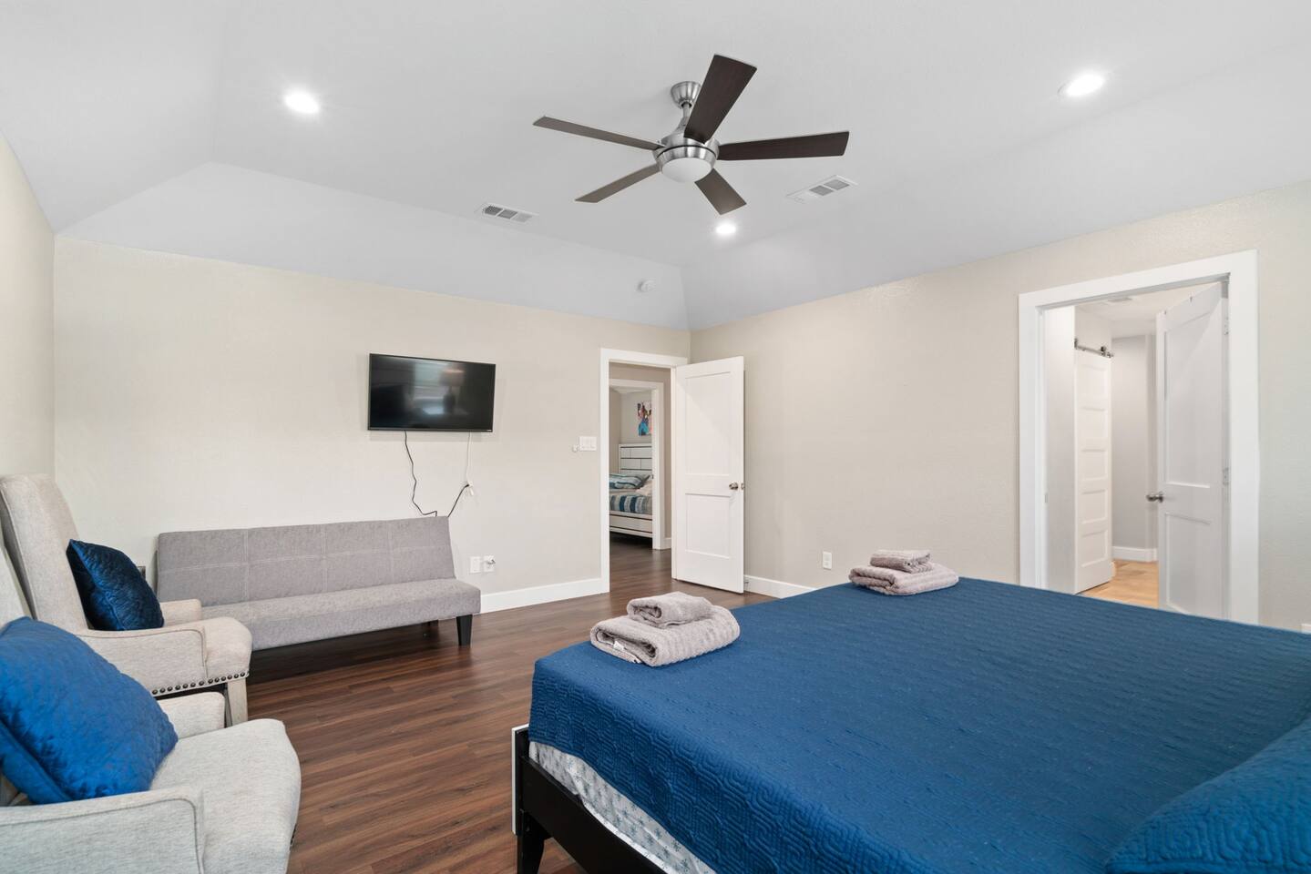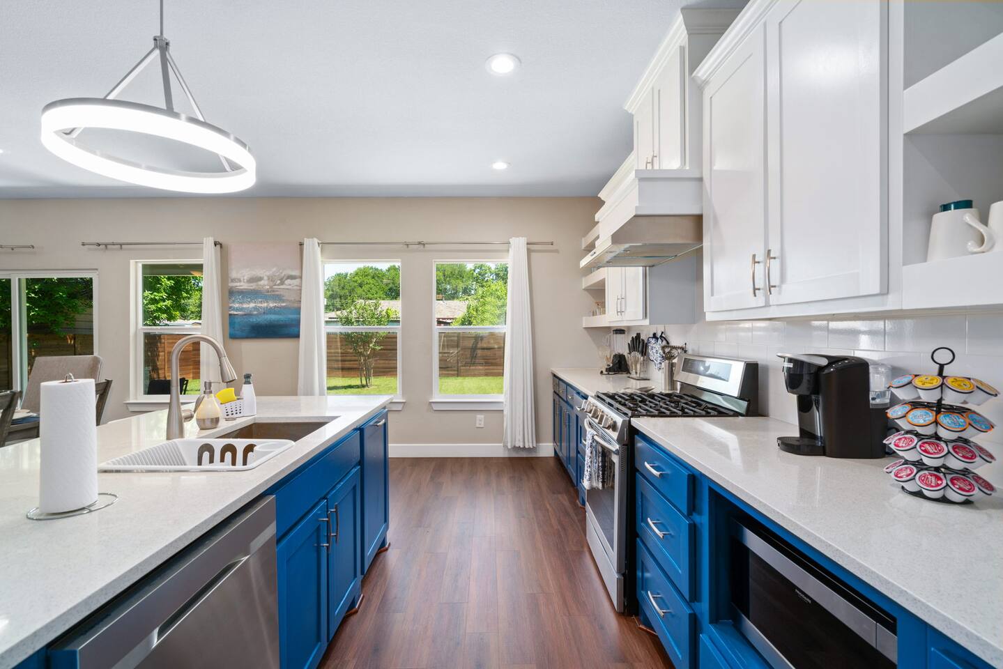 The beautiful open kitchen design lets you host large dinners more than comfortably as it is also fully stocked with everything you could need to cook big meals! Perfect for big groups, the massive dining table seats 10 along with the roomy kitchen island that seats 4. For caffeine lovers, the coffee station is complete with keurig pods as well as drip coffee for your use! Start or end your days with our fully stocked bright bathrooms that include all necessities and extras such as makeup remover wipes. Get restful nights with our comfy double/queen/king size beds. The living room couch is also a pull-out bed if more space is needed. The master bedroom features a luxurious king bed and mounted TV for all your watching needs! The master bathroom contains a stand-up shower but also a separate deep bathtub made to relax in after an eventful day. Watch the sunset outside in our second story balcony with a Dallas skyline view! The balcony is complete with a seating area to enjoy morning cups of coffee while watching the sunrise! The massive backyard features a patio seating area and plenty of room to entertain your guests, bring some picnic blankets and bask in the warm sun!