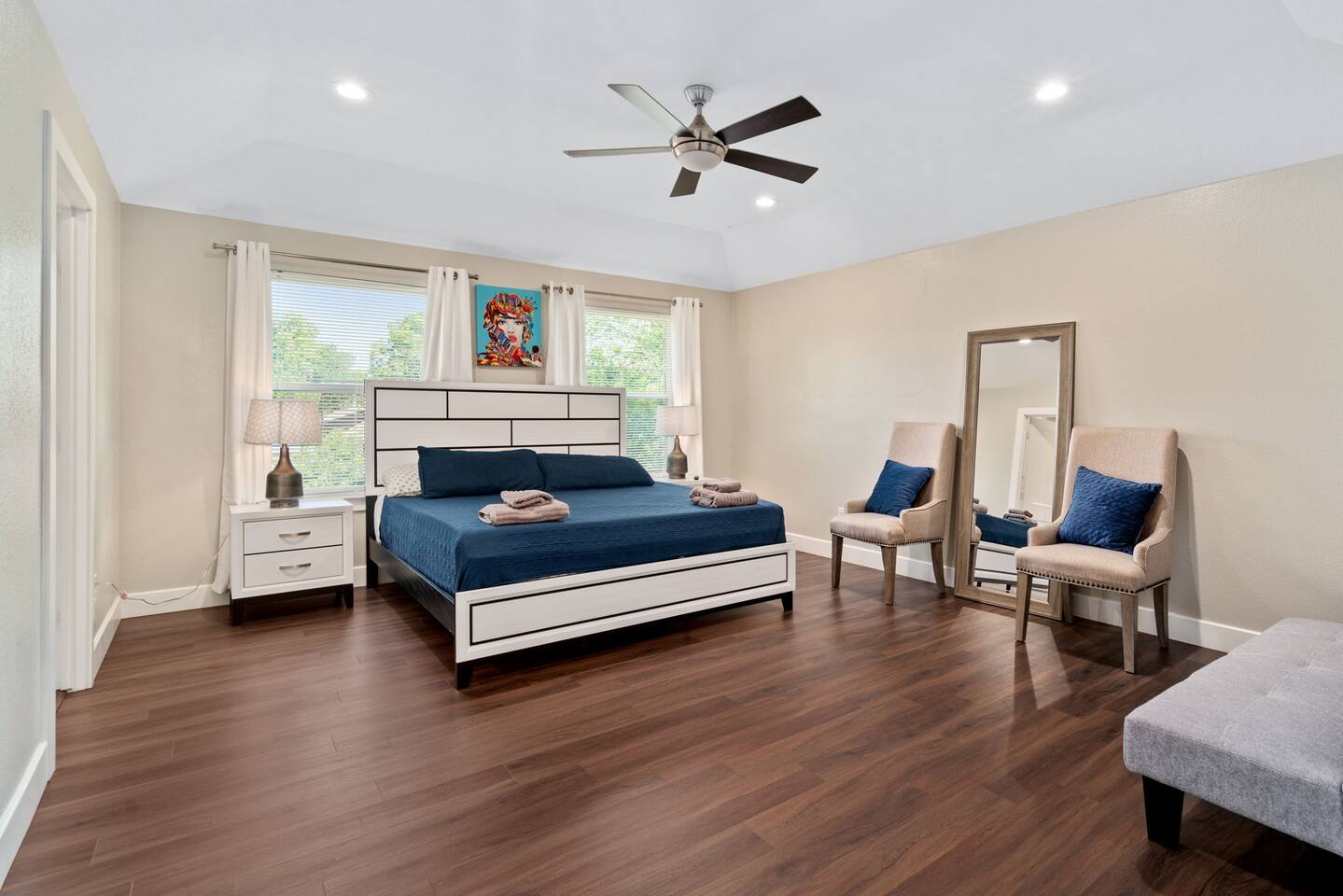 All spaces within the home are accessible to the guests except the utility room such as the supply closet and any attics/crawl spaces. The home features on-site parking in the two car garage as well as driveway which can accommodate up to six vehicles. Additional parking can be found near the street and in the empty lot across the street.