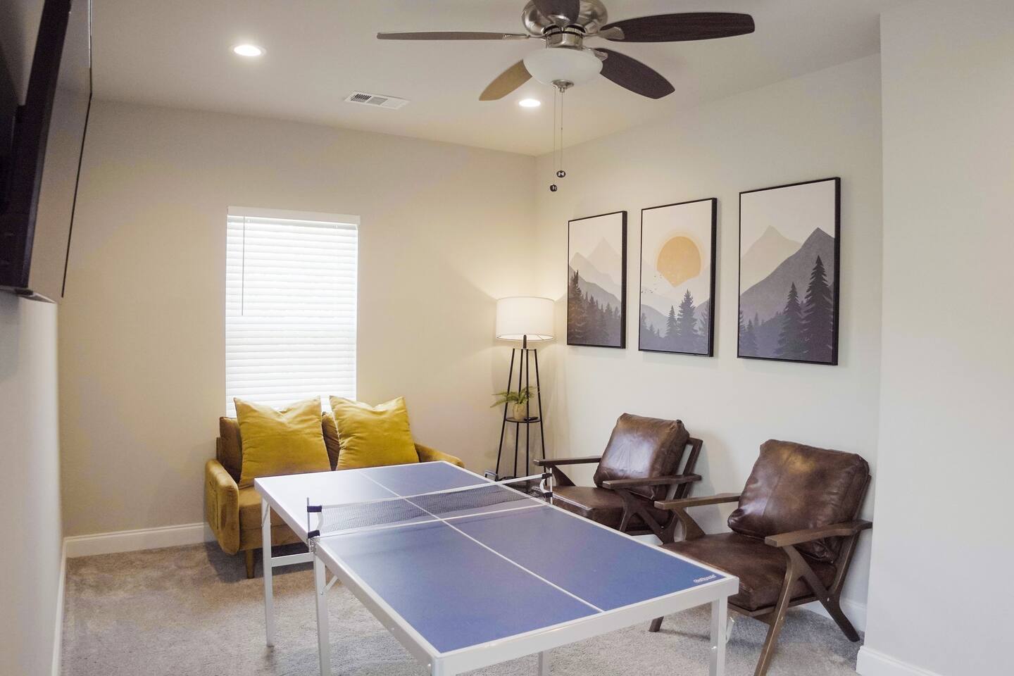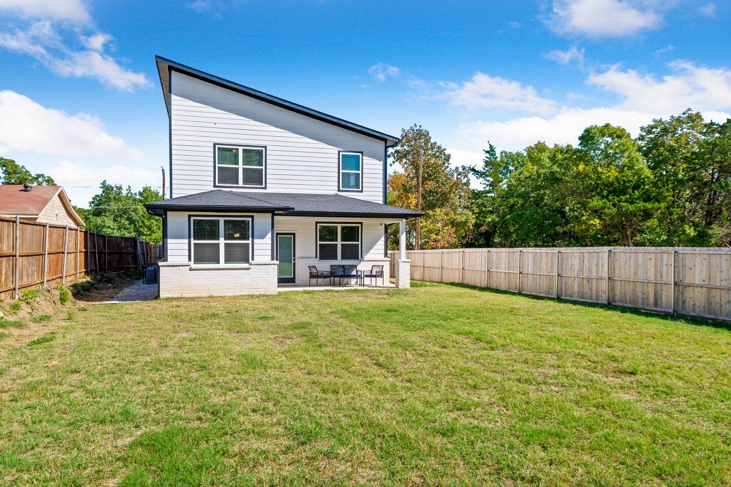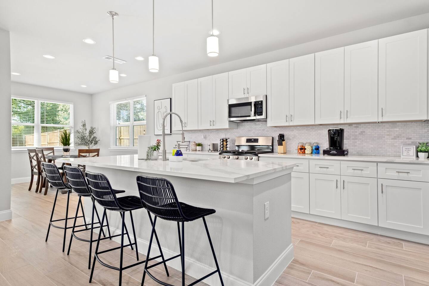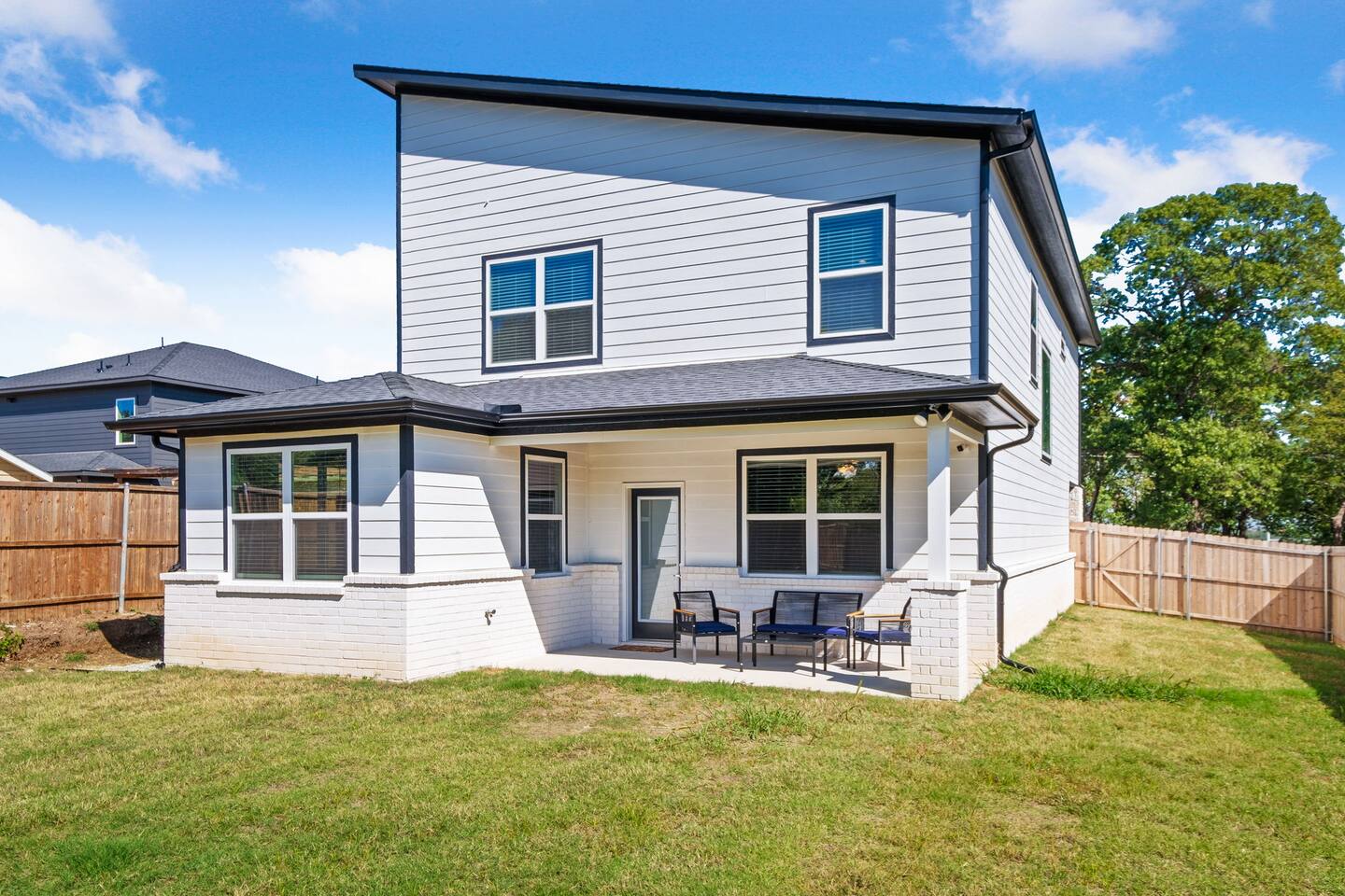 Featuring 5 BR's and 8 beds, this 2,877 sqft home has plenty of space to accommodate your next getaway! As you enter this beautiful and newly built home, you're greeted with warm natural light that comes in through all of the windows! The living room features luxurious and comfortable leather sofas to sit on while you enjoy watching your favorite shows on the 75" smart TV! Cozy up and snuggle next to the electric fireplace at night after a day out in the town! This home away from home features a full size kitchen that won't limit any at-home chef! Take advantage of the full size gas burner stove top and cook up your favorite meals using the provided kitchen utensils! Also included is a toaster, blender, and microwave giving you everything you could need while on your vacation! The kitchen also features basic seasonings, oils, and dishware for your convenience. Take advantage of the provided coffee station and start your day off right with a cup of joe! The oversized kitchen island provides plenty of cooking space to prepare a big feast! Serve up your creative cooking creations on the spacious wood dining table that seats 6 comfortably or on the oversized kitchen island that seats 4! Located downstairs is the first private BR that has an oh so comfortable queen bed for you to get a great nights rest on! Right down the hall is the convenient half bathroom, great to start your day in before hitting the city! As you make your way upstairs, you are greeted with the designated workspace for those who like to get work done while on the go! If you're looking for at-home entertainment, you'll find it in the upstairs game room with a smart TV and ping pong table! The second BR features two luxurious queen beds where you can watch TV from the comfort of your mattress! This BR also includes an attached spacious bathroom with double sinks, a walk-in shower, and a separate bath tub! Pamper yourself in style! The third BR has an full bed as well as a twin bed to accommodate multiple guests. After a long day of exploring the city, unwind while watching your favorite shows on the provided TV! The fourth BR features the same layout with a full bed, twin bed, and smart TV! The shared jack and jill style bathroom is convenient for multiple people to get ready at once! The fifth BR is private and includes a king bed and TV, as well as a private bathroom! Take advantage of all our bedroom space and make this home your next getaway spot! Featuring a spacious backyard, grab a picnic blanket and soak in the sun! Perfect for your furbabies and kids! Relax on the patio furniture while you enjoy the outdoors!