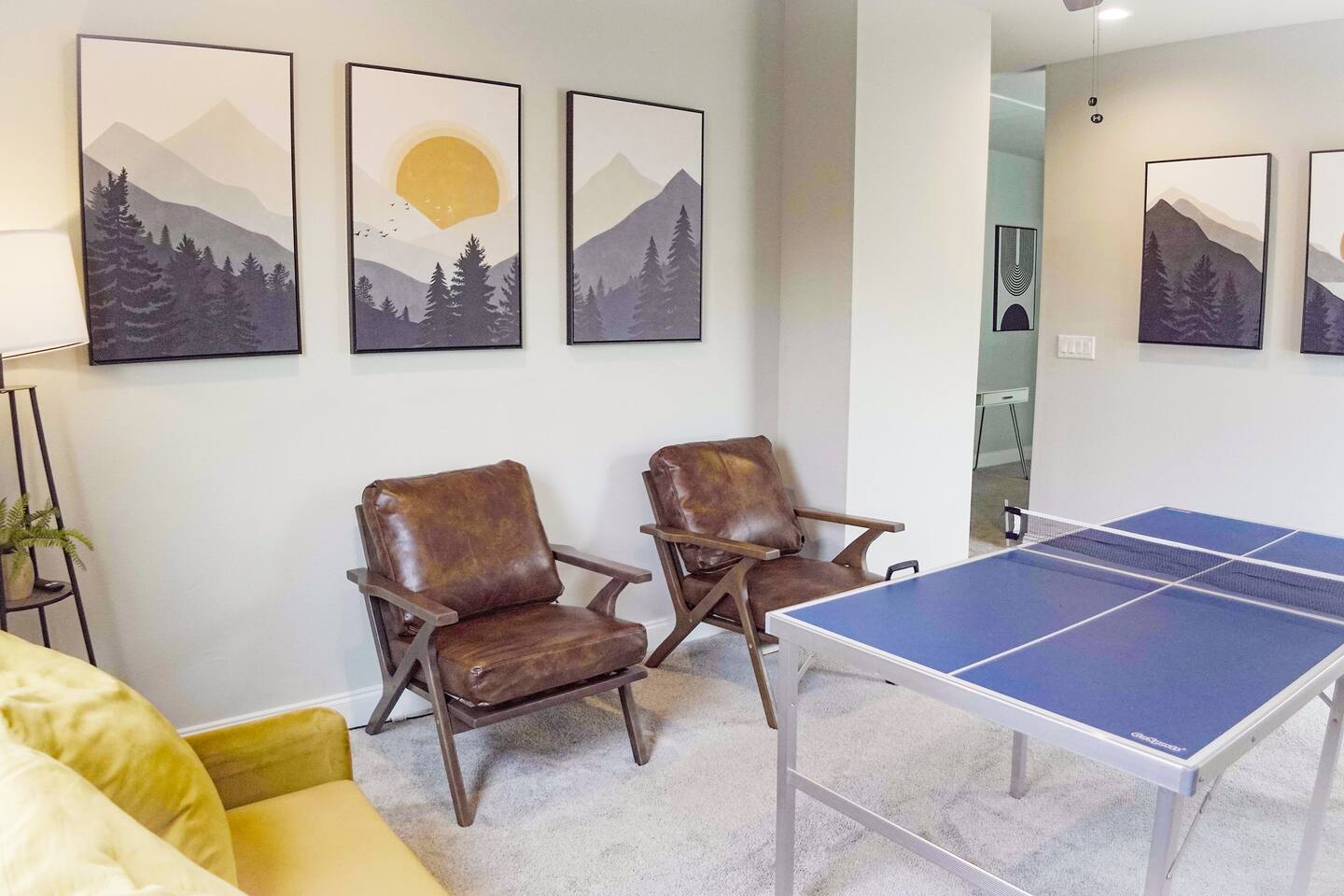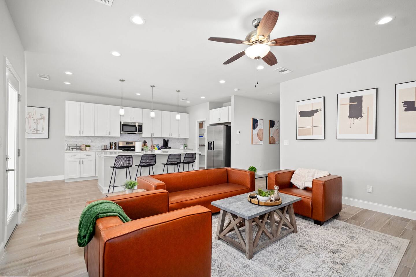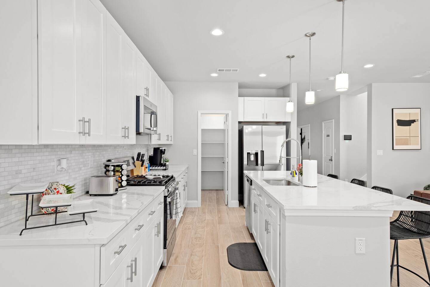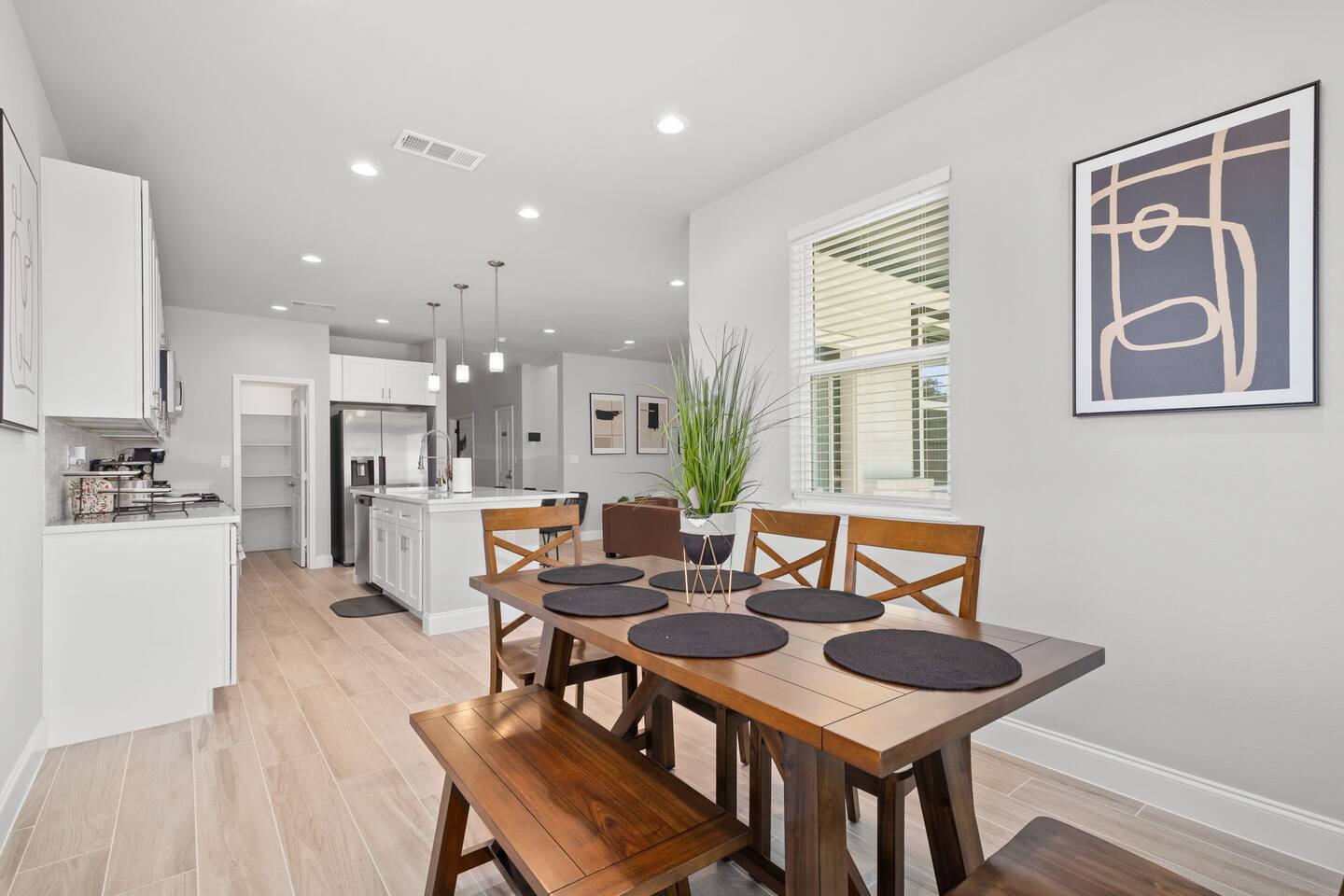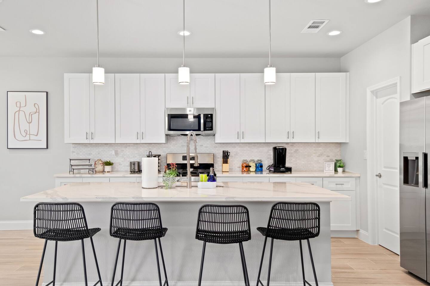 Featuring 5 BR's and 8 beds, this 2,877 sqft home has plenty of space to accommodate your next getaway! As you enter this beautiful and newly built home, you're greeted with warm natural light that comes in through all of the windows! The living room features luxurious and comfortable leather sofas to sit on while you enjoy watching your favorite shows on the 75" smart TV! Cozy up and snuggle next to the electric fireplace at night after a day out in the town! This home away from home features a full size kitchen that won't limit any at-home chef! Take advantage of the full size gas burner stove top and cook up your favorite meals using the provided kitchen utensils! Also included is a toaster, blender, and microwave giving you everything you could need while on your vacation! The kitchen also features basic seasonings, oils, and dishware for your convenience. Take advantage of the provided coffee station and start your day off right with a cup of joe! The oversized kitchen island provides plenty of cooking space to prepare a big feast! Serve up your creative cooking creations on the spacious wood dining table that seats 6 comfortably or on the oversized kitchen island that seats 4! Located downstairs is the first private BR that has an oh so comfortable queen bed for you to get a great nights rest on! Right down the hall is the convenient half bathroom, great to start your day in before hitting the city! As you make your way upstairs, you are greeted with the designated workspace for those who like to get work done while on the go! If you're looking for at-home entertainment, you'll find it in the upstairs game room with a smart TV and ping pong table! The second BR features two luxurious queen beds where you can watch TV from the comfort of your mattress! This BR also includes an attached spacious bathroom with double sinks, a walk-in shower, and a separate bath tub! Pamper yourself in style! The third BR has an full bed as well as a twin bed to accommodate multiple guests. After a long day of exploring the city, unwind while watching your favorite shows on the provided TV! The fourth BR features the same layout with a full bed, twin bed, and smart TV! The shared jack and jill style bathroom is convenient for multiple people to get ready at once! The fifth BR is private and includes a king bed and TV, as well as a private bathroom! Take advantage of all our bedroom space and make this home your next getaway spot! Featuring a spacious backyard, grab a picnic blanket and soak in the sun! Perfect for your furbabies and kids! Relax on the patio furniture while you enjoy the outdoors!