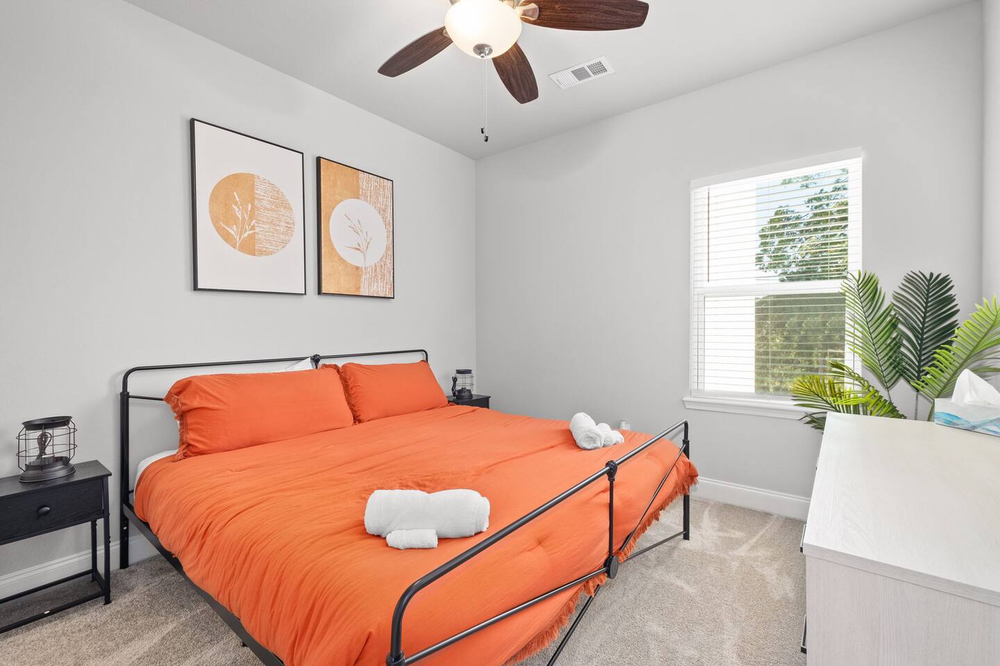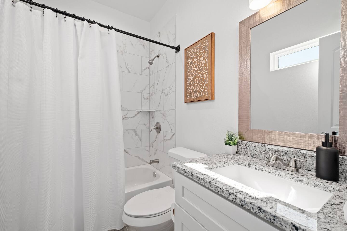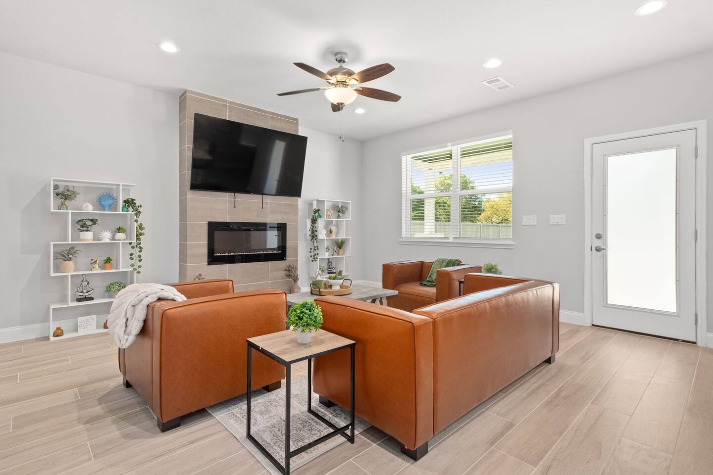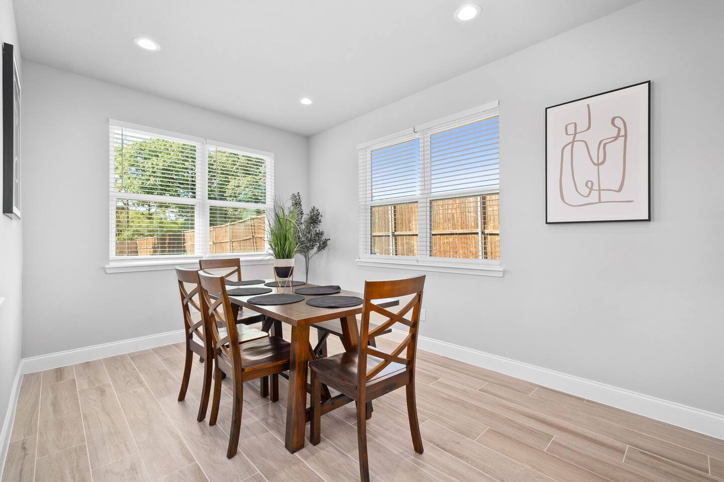 Featuring 5 BR's and 8 beds, this 2,877 sqft home has plenty of space to accommodate your next getaway! As you enter this beautiful and newly built home, you're greeted with warm natural light that comes in through all of the windows! The living room features luxurious and comfortable leather sofas to sit on while you enjoy watching your favorite shows on the 75" smart TV! Cozy up and snuggle next to the electric fireplace at night after a day out in the town! This home away from home features a full size kitchen that won't limit any at-home chef! Take advantage of the full size gas burner stove top and cook up your favorite meals using the provided kitchen utensils! Also included is a toaster, blender, and microwave giving you everything you could need while on your vacation! The kitchen also features basic seasonings, oils, and dishware for your convenience. Take advantage of the provided coffee station and start your day off right with a cup of joe! The oversized kitchen island provides plenty of cooking space to prepare a big feast! Serve up your creative cooking creations on the spacious wood dining table that seats 6 comfortably or on the oversized kitchen island that seats 4! Located downstairs is the first private BR that has an oh so comfortable queen bed for you to get a great nights rest on! Right down the hall is the convenient half bathroom, great to start your day in before hitting the city! As you make your way upstairs, you are greeted with the designated workspace for those who like to get work done while on the go! If you're looking for at-home entertainment, you'll find it in the upstairs game room with a smart TV and ping pong table! The second BR features two luxurious queen beds where you can watch TV from the comfort of your mattress! This BR also includes an attached spacious bathroom with double sinks, a walk-in shower, and a separate bath tub! Pamper yourself in style! The third BR has an full bed as well as a twin bed to accommodate multiple guests. After a long day of exploring the city, unwind while watching your favorite shows on the provided TV! The fourth BR features the same layout with a full bed, twin bed, and smart TV! The shared jack and jill style bathroom is convenient for multiple people to get ready at once! The fifth BR is private and includes a king bed and TV, as well as a private bathroom! Take advantage of all our bedroom space and make this home your next getaway spot! Featuring a spacious backyard, grab a picnic blanket and soak in the sun! Perfect for your furbabies and kids! Relax on the patio furniture while you enjoy the outdoors!
