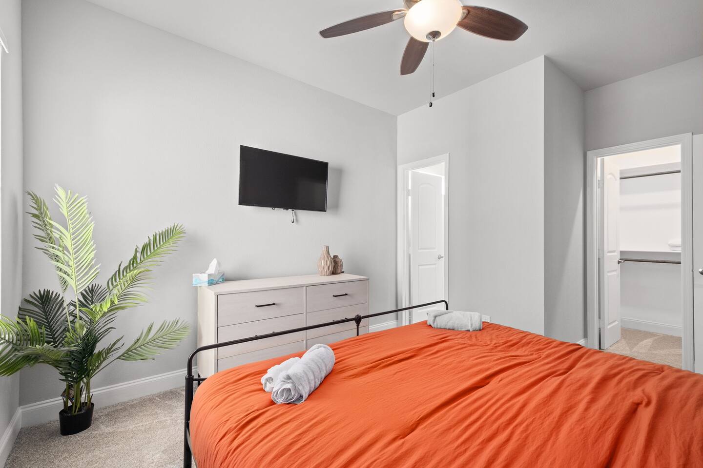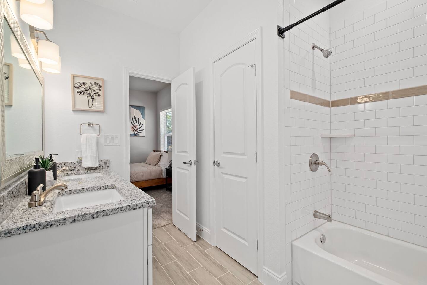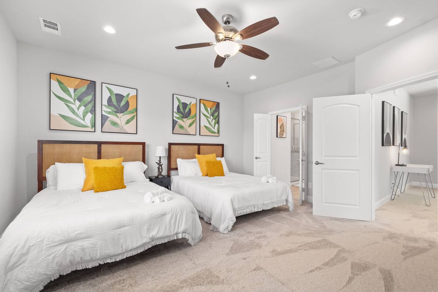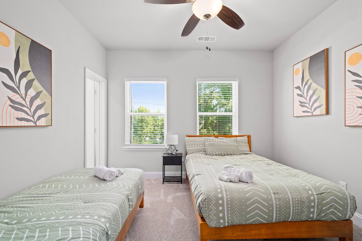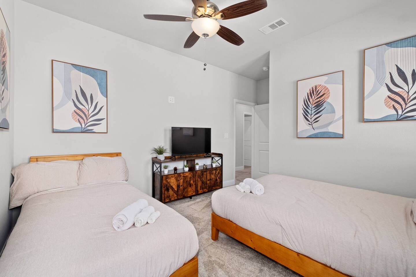 Featuring 5 BR's and 8 beds, this 2,877 sqft home has plenty of space to accommodate your next getaway! As you enter this beautiful and newly built home, you're greeted with warm natural light that comes in through all of the windows! The living room features luxurious and comfortable leather sofas to sit on while you enjoy watching your favorite shows on the 75" smart TV! Cozy up and snuggle next to the electric fireplace at night after a day out in the town! This home away from home features a full size kitchen that won't limit any at-home chef! Take advantage of the full size gas burner stove top and cook up your favorite meals using the provided kitchen utensils! Also included is a toaster, blender, and microwave giving you everything you could need while on your vacation! The kitchen also features basic seasonings, oils, and dishware for your convenience. Take advantage of the provided coffee station and start your day off right with a cup of joe! The oversized kitchen island provides plenty of cooking space to prepare a big feast! Serve up your creative cooking creations on the spacious wood dining table that seats 6 comfortably or on the oversized kitchen island that seats 4! Located downstairs is the first private BR that has an oh so comfortable queen bed for you to get a great nights rest on! Right down the hall is the convenient half bathroom, great to start your day in before hitting the city! As you make your way upstairs, you are greeted with the designated workspace for those who like to get work done while on the go! If you're looking for at-home entertainment, you'll find it in the upstairs game room with a smart TV and ping pong table! The second BR features two luxurious queen beds where you can watch TV from the comfort of your mattress! This BR also includes an attached spacious bathroom with double sinks, a walk-in shower, and a separate bath tub! Pamper yourself in style! The third BR has an full bed as well as a twin bed to accommodate multiple guests. After a long day of exploring the city, unwind while watching your favorite shows on the provided TV! The fourth BR features the same layout with a full bed, twin bed, and smart TV! The shared jack and jill style bathroom is convenient for multiple people to get ready at once! The fifth BR is private and includes a king bed and TV, as well as a private bathroom! Take advantage of all our bedroom space and make this home your next getaway spot! Featuring a spacious backyard, grab a picnic blanket and soak in the sun! Perfect for your furbabies and kids! Relax on the patio furniture while you enjoy the outdoors!