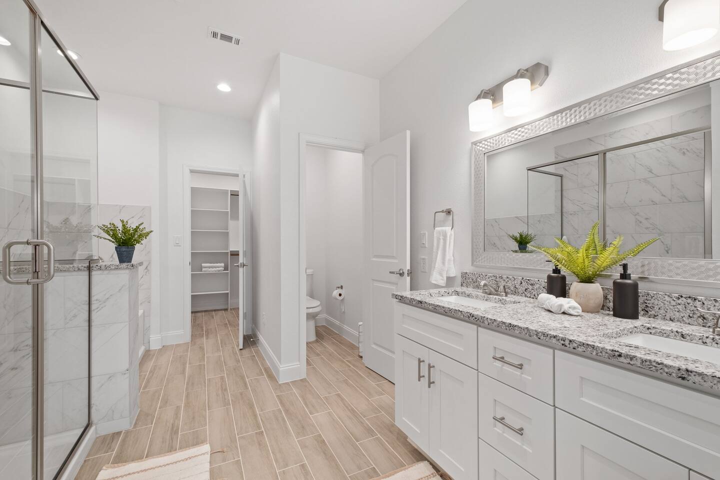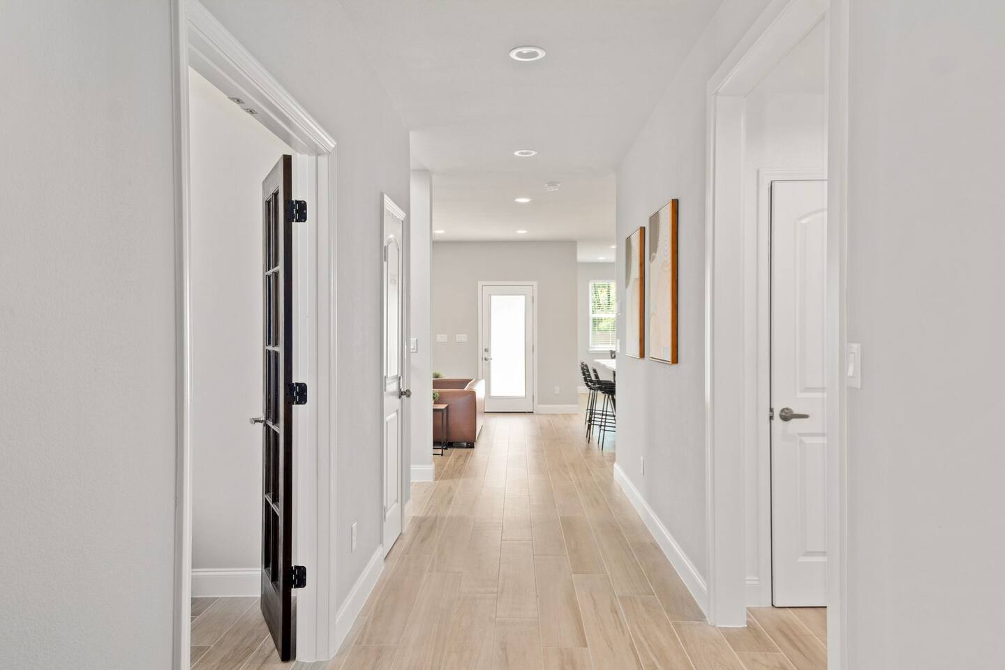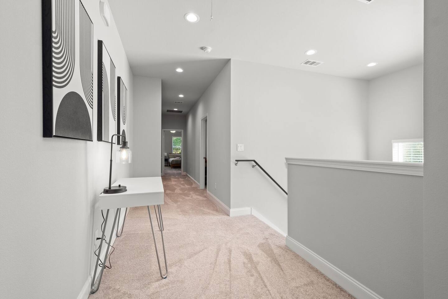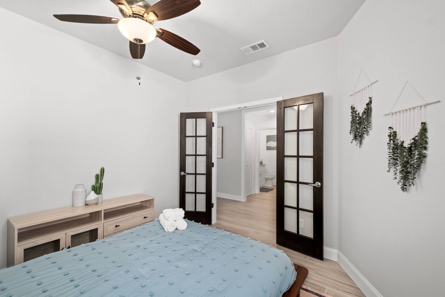 Featuring 5 BR's and 8 beds, this 2,877 sqft home has plenty of space to accommodate your next getaway! As you enter this beautiful and newly built home, you're greeted with warm natural light that comes in through all of the windows! The living room features luxurious and comfortable leather sofas to sit on while you enjoy watching your favorite shows on the 75" smart TV! Cozy up and snuggle next to the electric fireplace at night after a day out in the town! This home away from home features a full size kitchen that won't limit any at-home chef! Take advantage of the full size gas burner stove top and cook up your favorite meals using the provided kitchen utensils! Also included is a toaster, blender, and microwave giving you everything you could need while on your vacation! The kitchen also features basic seasonings, oils, and dishware for your convenience. Take advantage of the provided coffee station and start your day off right with a cup of joe! The oversized kitchen island provides plenty of cooking space to prepare a big feast! Serve up your creative cooking creations on the spacious wood dining table that seats 6 comfortably or on the oversized kitchen island that seats 4! Located downstairs is the first private BR that has an oh so comfortable queen bed for you to get a great nights rest on! Right down the hall is the convenient half bathroom, great to start your day in before hitting the city! As you make your way upstairs, you are greeted with the designated workspace for those who like to get work done while on the go! If you're looking for at-home entertainment, you'll find it in the upstairs game room with a smart TV and ping pong table! The second BR features two luxurious queen beds where you can watch TV from the comfort of your mattress! This BR also includes an attached spacious bathroom with double sinks, a walk-in shower, and a separate bath tub! Pamper yourself in style! The third BR has an full bed as well as a twin bed to accommodate multiple guests. After a long day of exploring the city, unwind while watching your favorite shows on the provided TV! The fourth BR features the same layout with a full bed, twin bed, and smart TV! The shared jack and jill style bathroom is convenient for multiple people to get ready at once! The fifth BR is private and includes a king bed and TV, as well as a private bathroom! Take advantage of all our bedroom space and make this home your next getaway spot! Featuring a spacious backyard, grab a picnic blanket and soak in the sun! Perfect for your furbabies and kids! Relax on the patio furniture while you enjoy the outdoors!