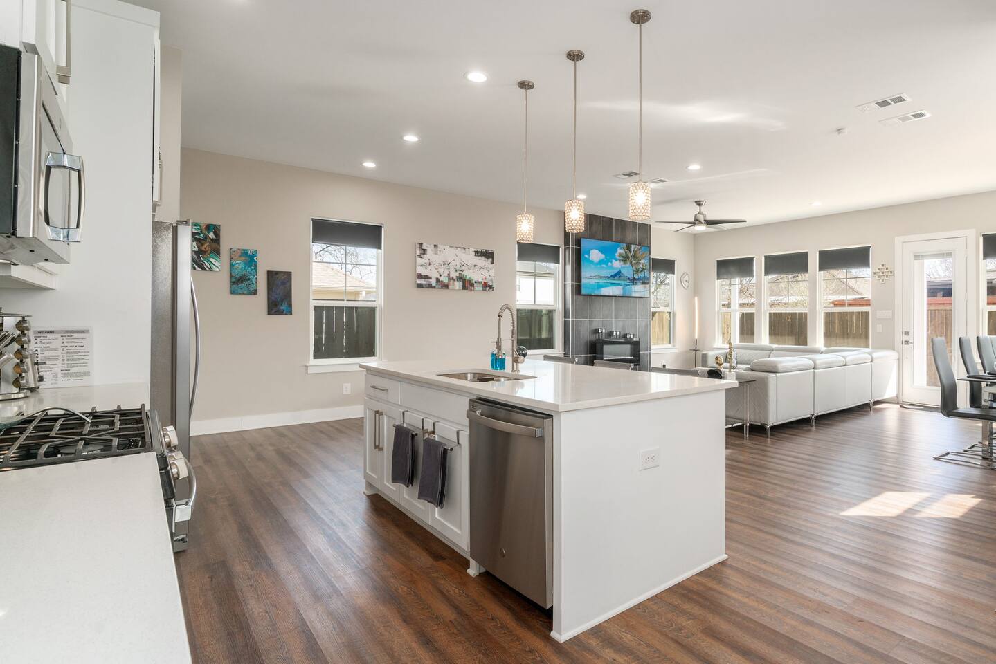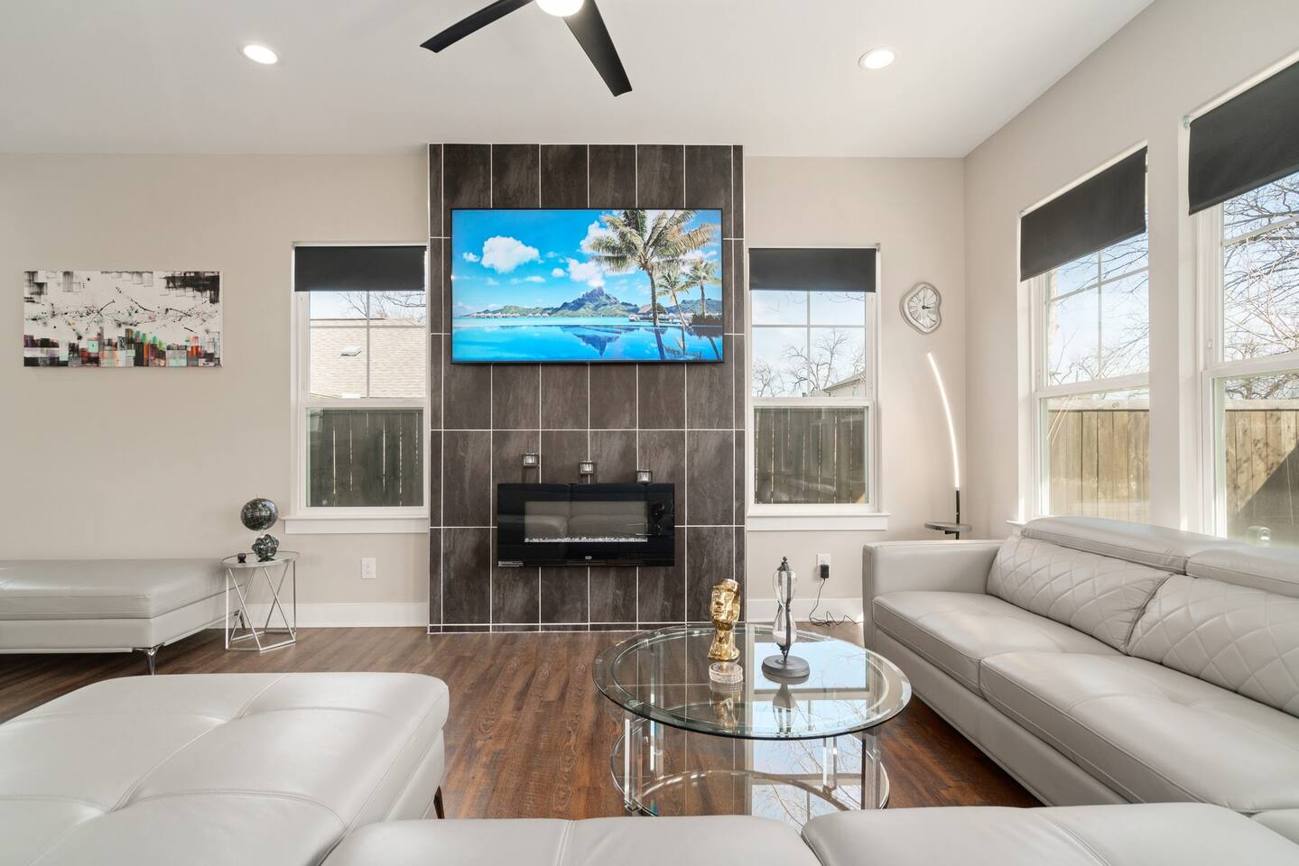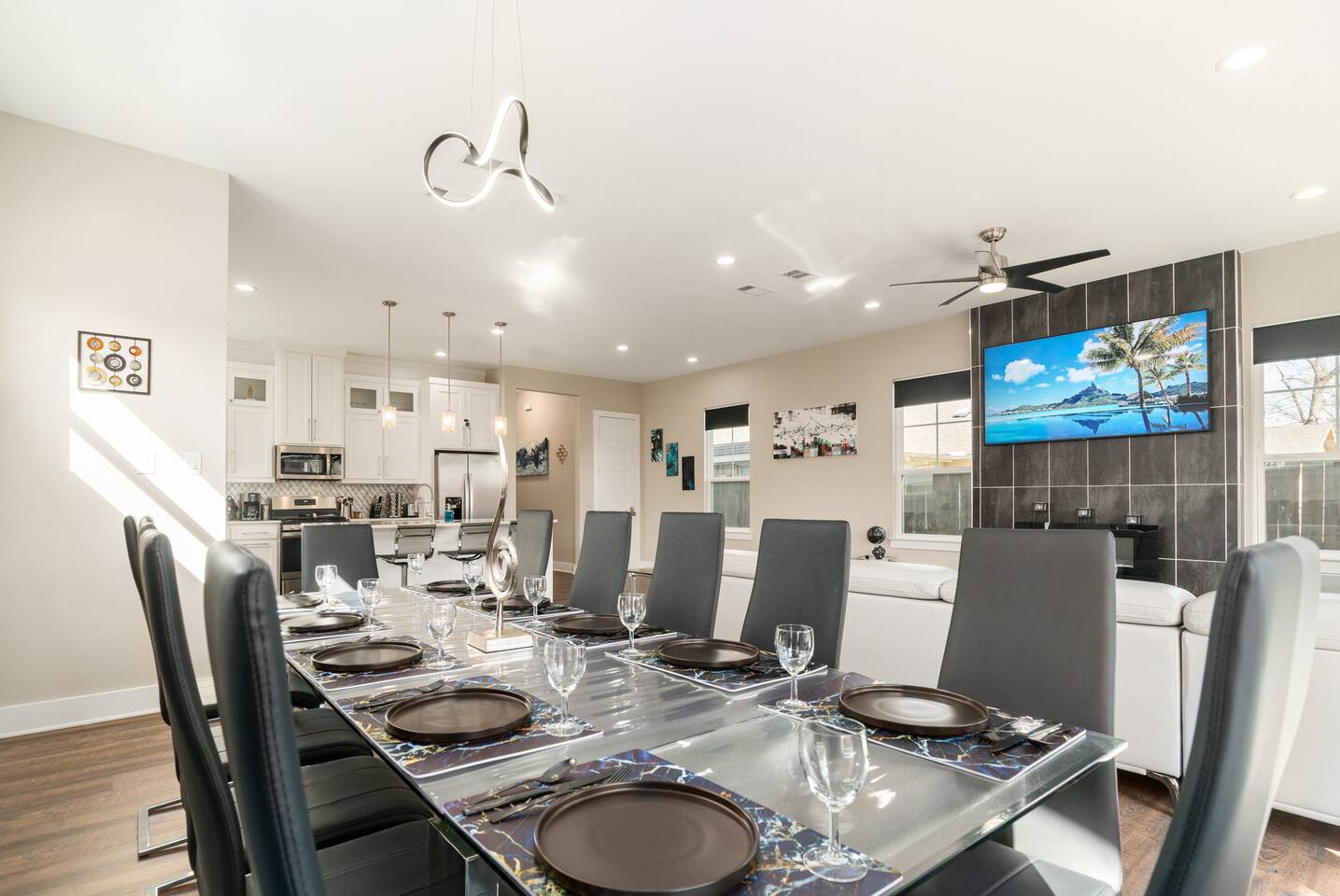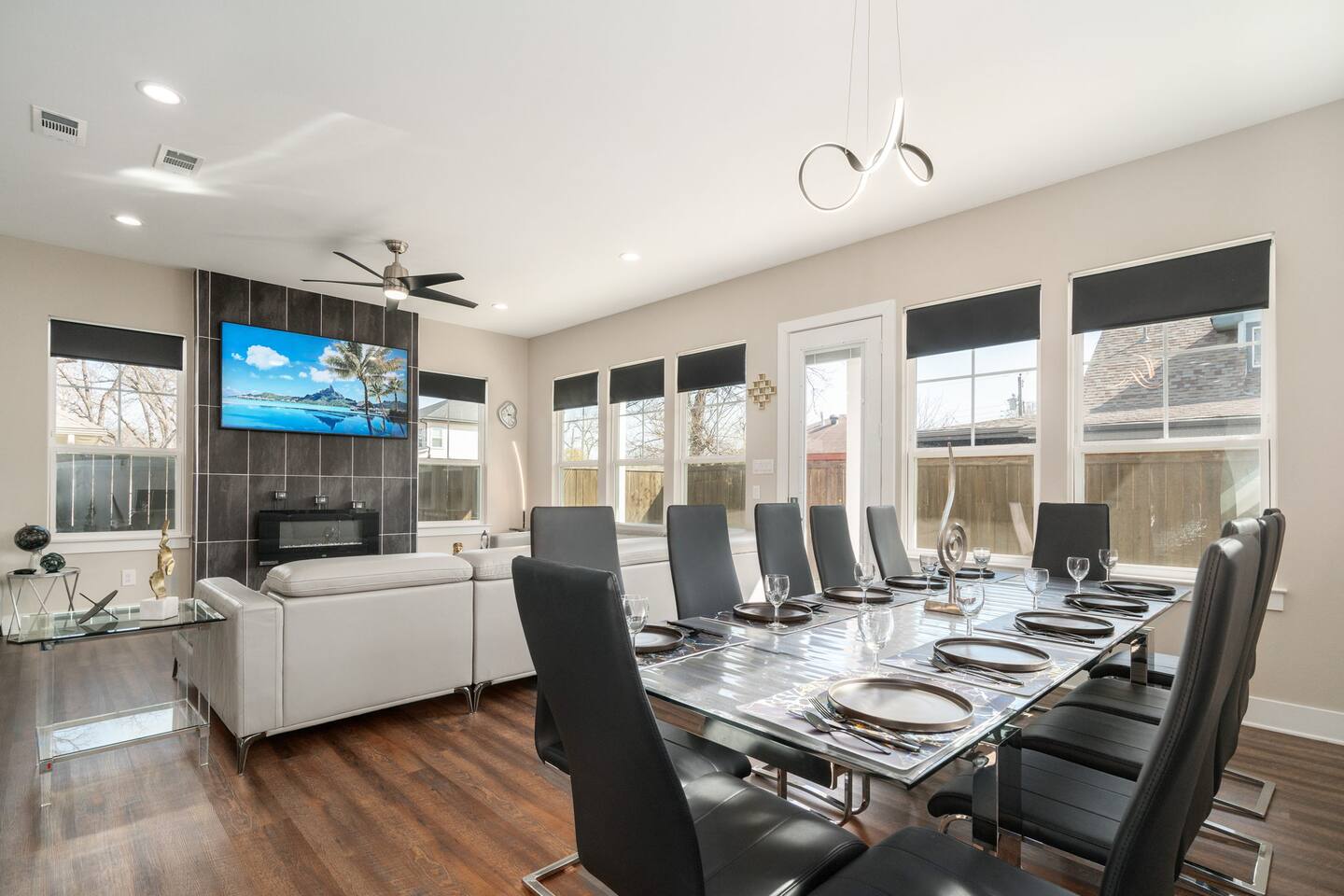 This modern home welcomes you with open arms as you enter the living room that features sleek and contemporary decor, relax in style while you catch up on the news or watch the game on the 77” HDTV above the electric fireplace and get comfy on the large leather sectional! The Art House features a fully stocked kitchen with everything an at-home chef could need to make great meals as well as a gigantic dining table that seats 12 and is made to host big feasts! The kitchen is equipped with a plethora of cooking utensils, spices, unique stoneware, and stylish silverware to compliment your celebratory dinners. There is also a second living room upstairs that includes an HDTV and a large leather sectional next to a beautiful custom accent wall. The Art House provides ample common space for your guests. Each aspect of the home was designed with intention and purpose, such as the all white towels and sheets for that hotel feel. Get a rejuvenating sleeping experience with our bedrooms that feature at least new queen size mattresses and black-out blinds. All bedrooms are located on the second story. The master bedroom contains a king size memory foam bed for a comfortable night's sleep after exploring Dallas! Our guests enjoy the mattresses so much, they inquire what mattresses we use! Grab a cup of coffee and enjoy the sunrise outside on the balcony featured in the master bedroom that has a partial skyline view of Dallas! There are three full bathrooms total and the tankless water heater provides hot water continuously to accommodate large groups getting ready at the same time. One bathroom features a combination stand-in shower/tub, the second features a spacious stand-in shower and the master bathroom features a stand-in shower and a separate jetted bathtub. The master bathroom also includes double vanity sinks and provides a great place to relax and pamper at the beginning or end of your day!