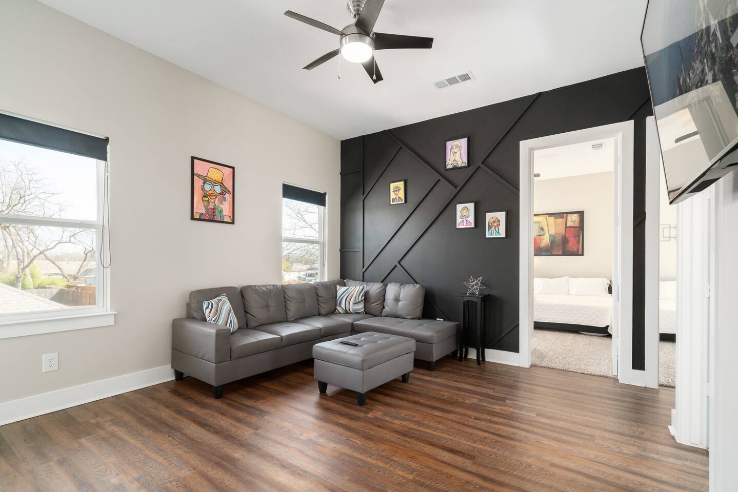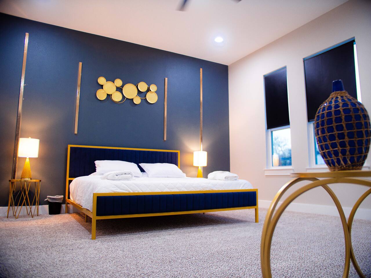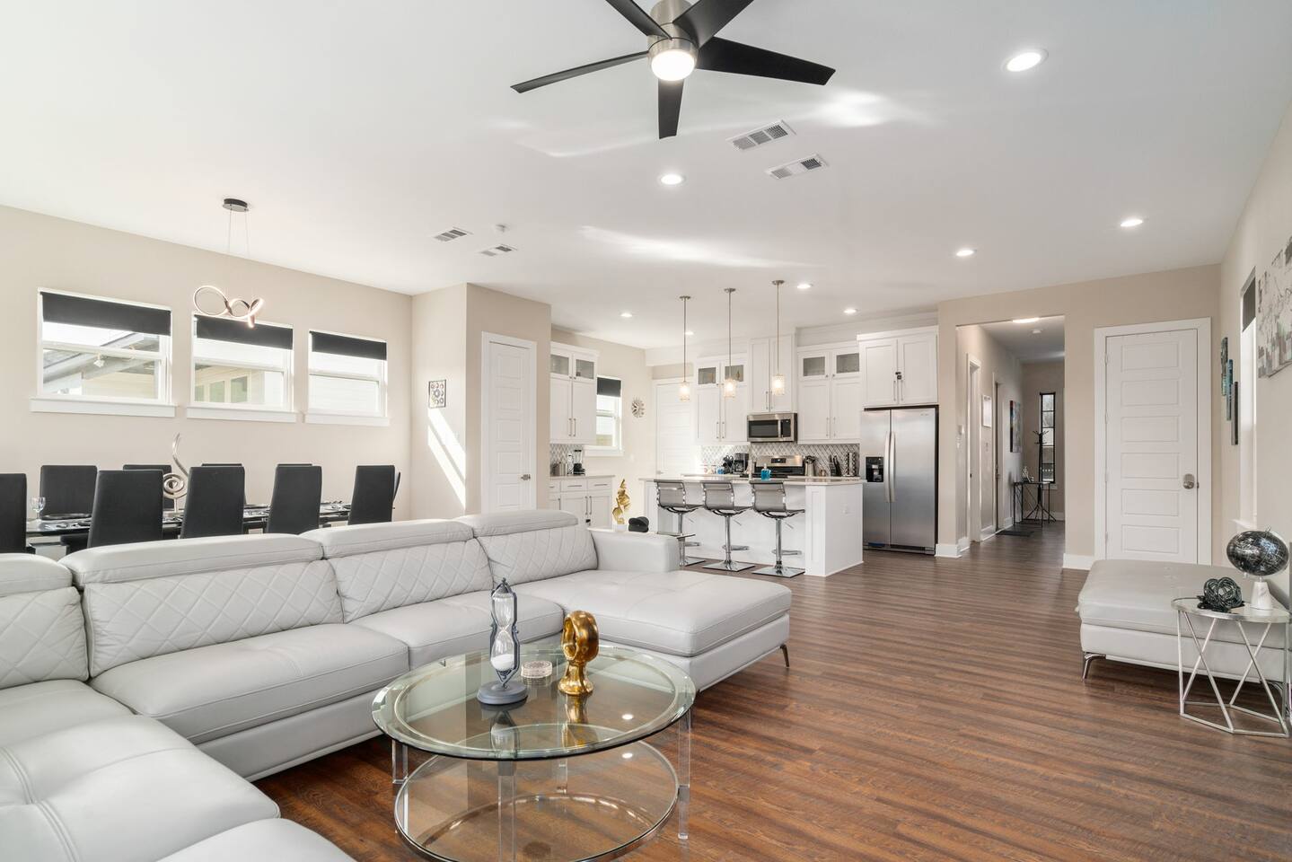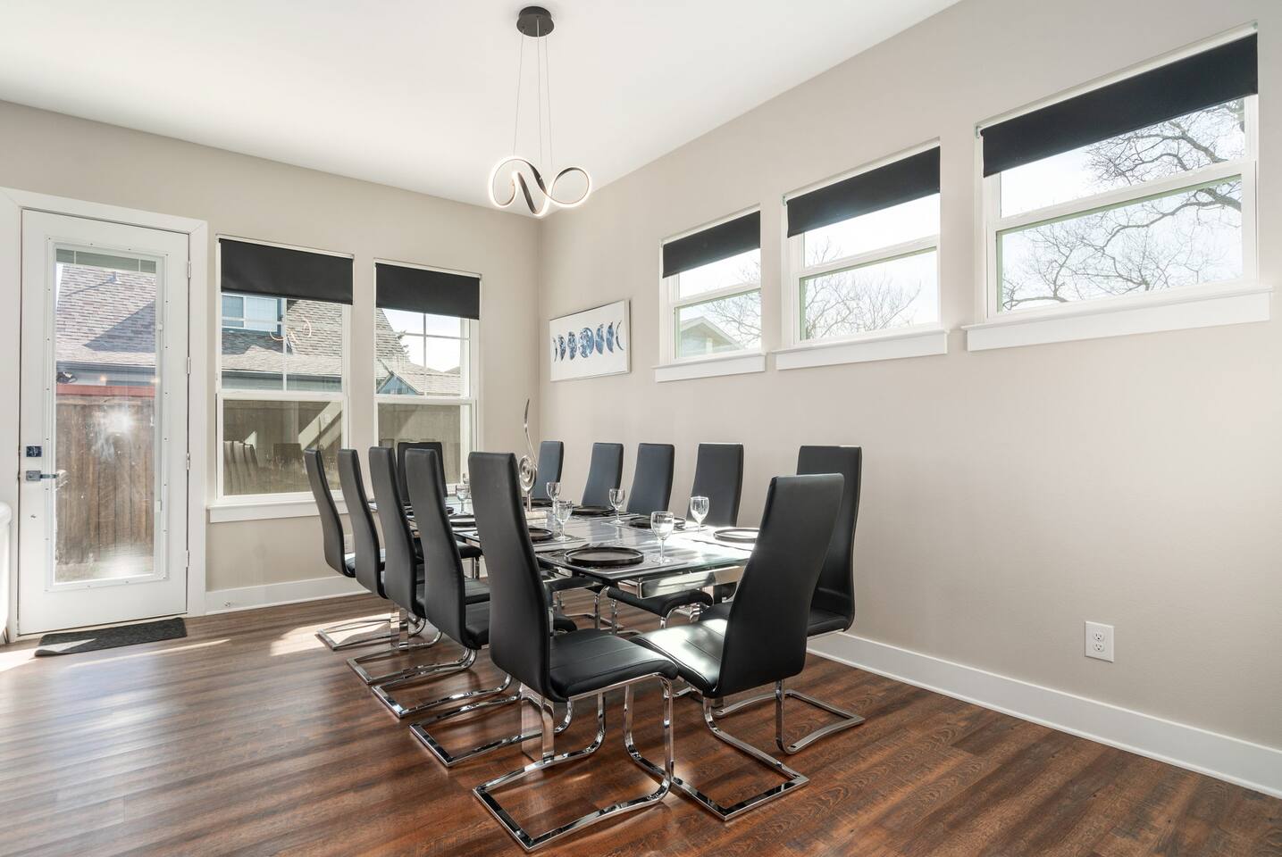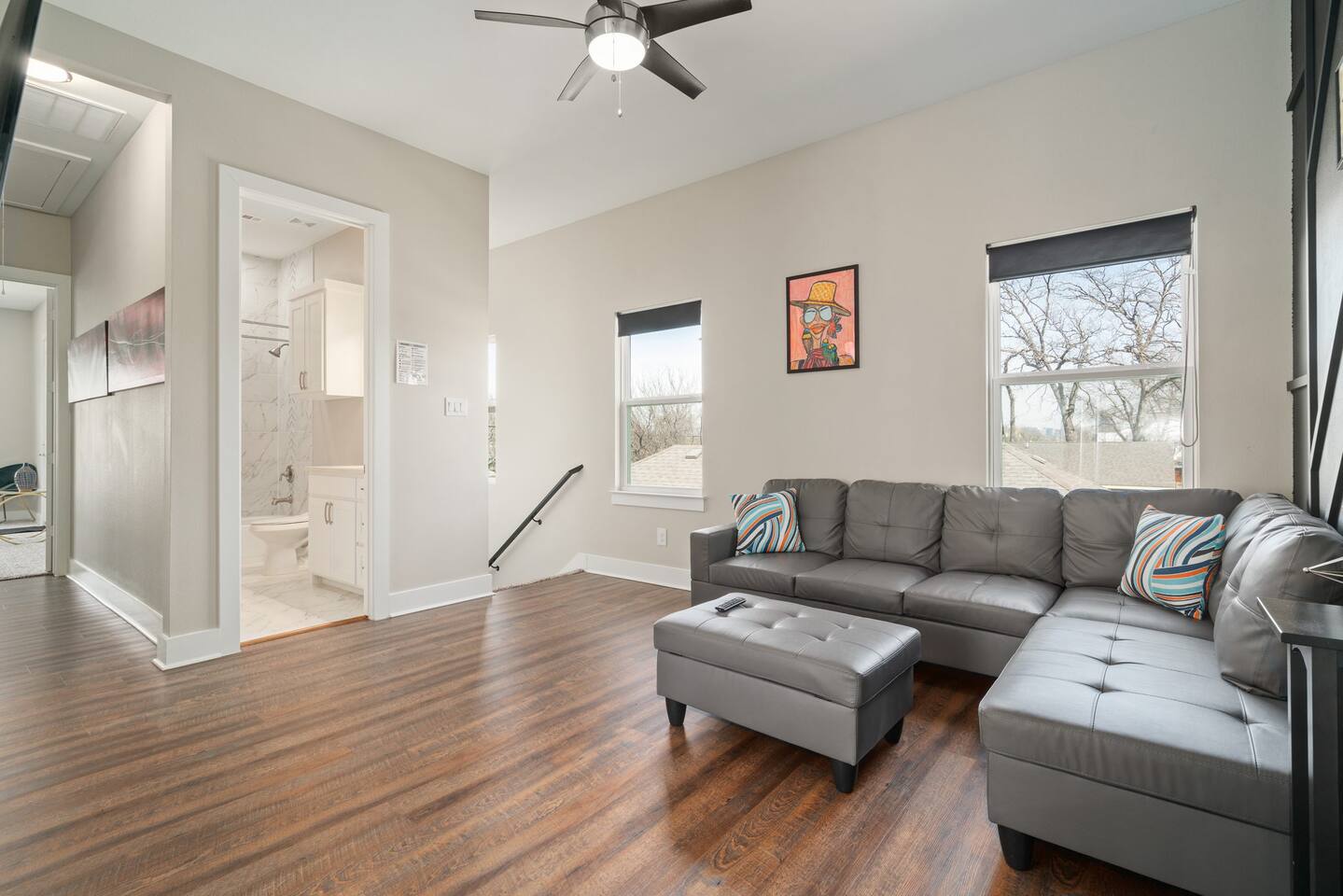 This modern home welcomes you with open arms as you enter the living room that features sleek and contemporary decor, relax in style while you catch up on the news or watch the game on the 77” HDTV above the electric fireplace and get comfy on the large leather sectional! The Art House features a fully stocked kitchen with everything an at-home chef could need to make great meals as well as a gigantic dining table that seats 12 and is made to host big feasts! The kitchen is equipped with a plethora of cooking utensils, spices, unique stoneware, and stylish silverware to compliment your celebratory dinners. There is also a second living room upstairs that includes an HDTV and a large leather sectional next to a beautiful custom accent wall. The Art House provides ample common space for your guests. Each aspect of the home was designed with intention and purpose, such as the all white towels and sheets for that hotel feel. Get a rejuvenating sleeping experience with our bedrooms that feature at least new queen size mattresses and black-out blinds. All bedrooms are located on the second story. The master bedroom contains a king size memory foam bed for a comfortable night's sleep after exploring Dallas! Our guests enjoy the mattresses so much, they inquire what mattresses we use! Grab a cup of coffee and enjoy the sunrise outside on the balcony featured in the master bedroom that has a partial skyline view of Dallas! There are three full bathrooms total and the tankless water heater provides hot water continuously to accommodate large groups getting ready at the same time. One bathroom features a combination stand-in shower/tub, the second features a spacious stand-in shower and the master bathroom features a stand-in shower and a separate jetted bathtub. The master bathroom also includes double vanity sinks and provides a great place to relax and pamper at the beginning or end of your day!