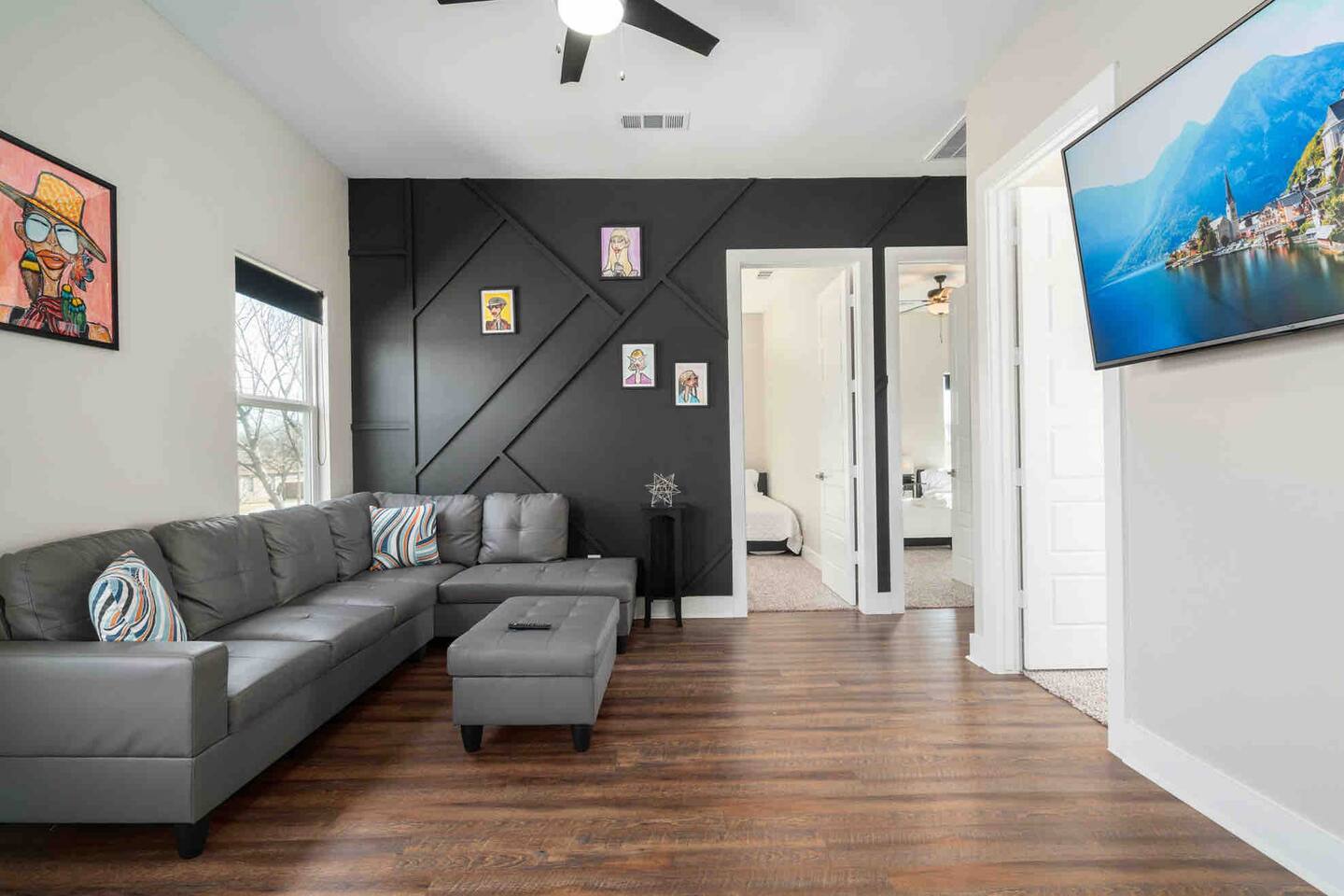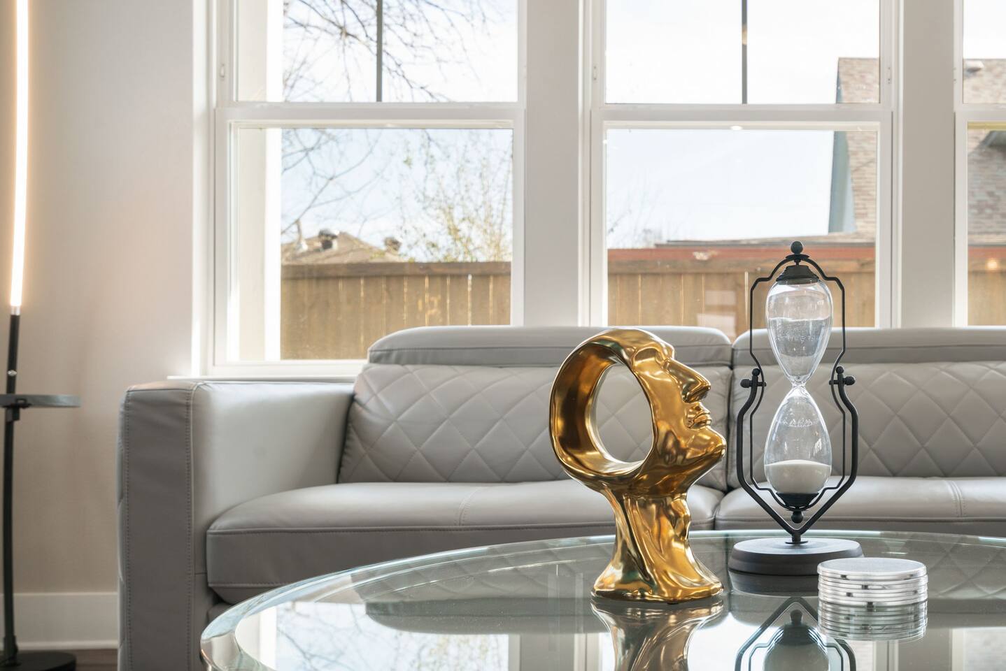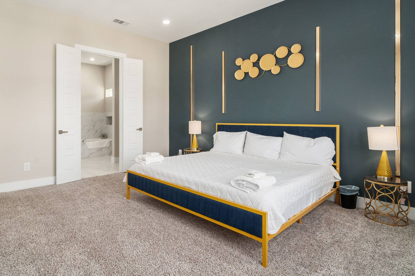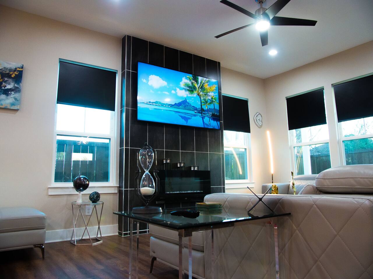 This modern home welcomes you with open arms as you enter the living room that features sleek and contemporary decor, relax in style while you catch up on the news or watch the game on the 77” HDTV above the electric fireplace and get comfy on the large leather sectional! The Art House features a fully stocked kitchen with everything an at-home chef could need to make great meals as well as a gigantic dining table that seats 12 and is made to host big feasts! The kitchen is equipped with a plethora of cooking utensils, spices, unique stoneware, and stylish silverware to compliment your celebratory dinners. There is also a second living room upstairs that includes an HDTV and a large leather sectional next to a beautiful custom accent wall. The Art House provides ample common space for your guests. Each aspect of the home was designed with intention and purpose, such as the all white towels and sheets for that hotel feel. Get a rejuvenating sleeping experience with our bedrooms that feature at least new queen size mattresses and black-out blinds. All bedrooms are located on the second story. The master bedroom contains a king size memory foam bed for a comfortable night's sleep after exploring Dallas! Our guests enjoy the mattresses so much, they inquire what mattresses we use! Grab a cup of coffee and enjoy the sunrise outside on the balcony featured in the master bedroom that has a partial skyline view of Dallas! There are three full bathrooms total and the tankless water heater provides hot water continuously to accommodate large groups getting ready at the same time. One bathroom features a combination stand-in shower/tub, the second features a spacious stand-in shower and the master bathroom features a stand-in shower and a separate jetted bathtub. The master bathroom also includes double vanity sinks and provides a great place to relax and pamper at the beginning or end of your day!