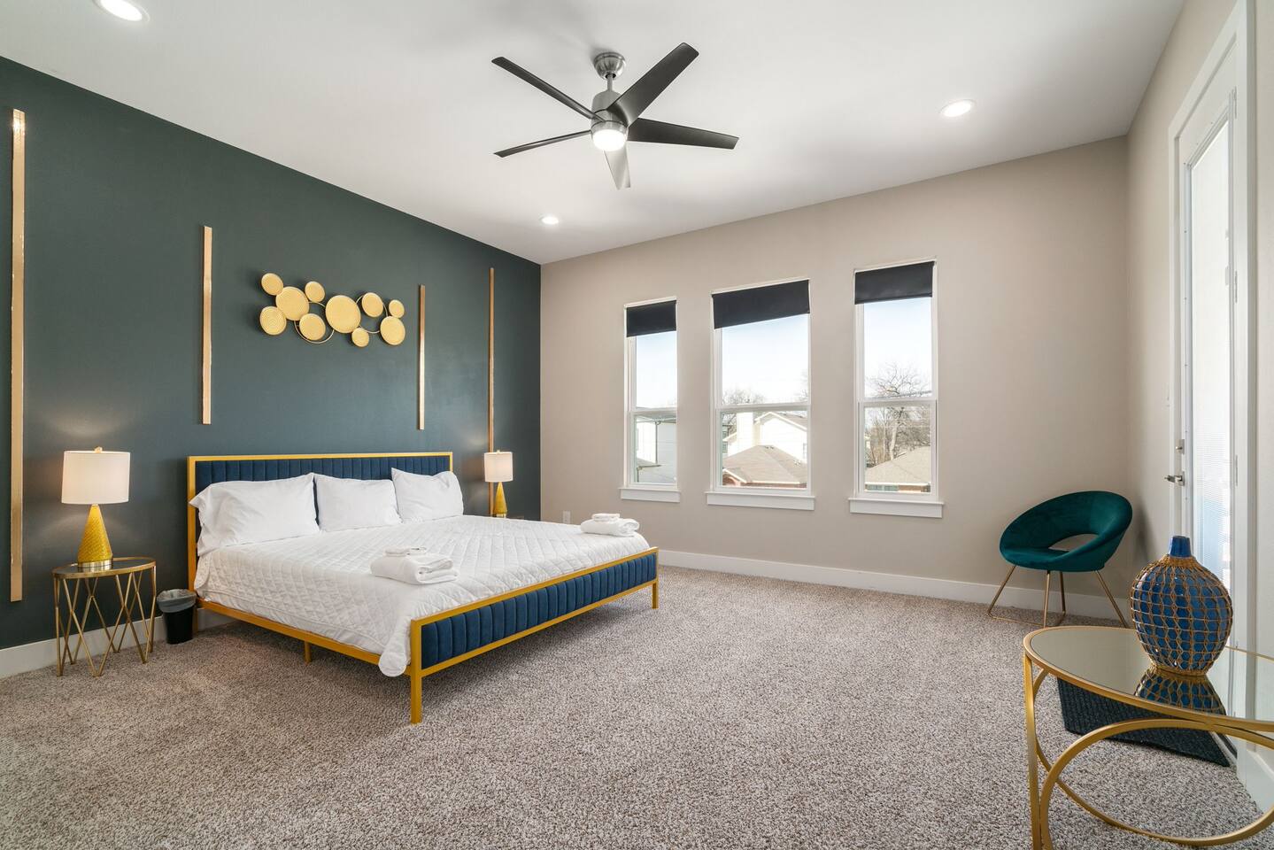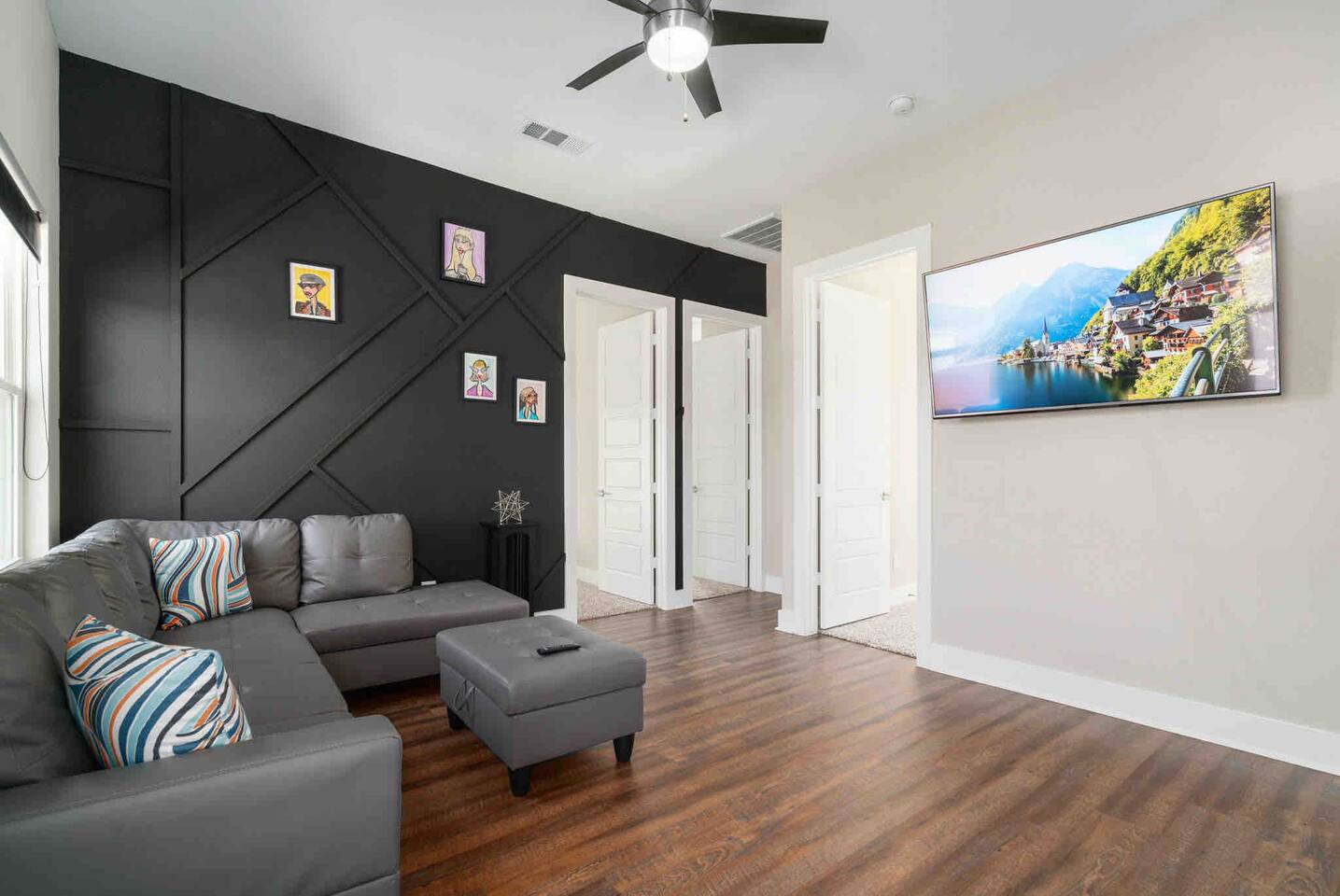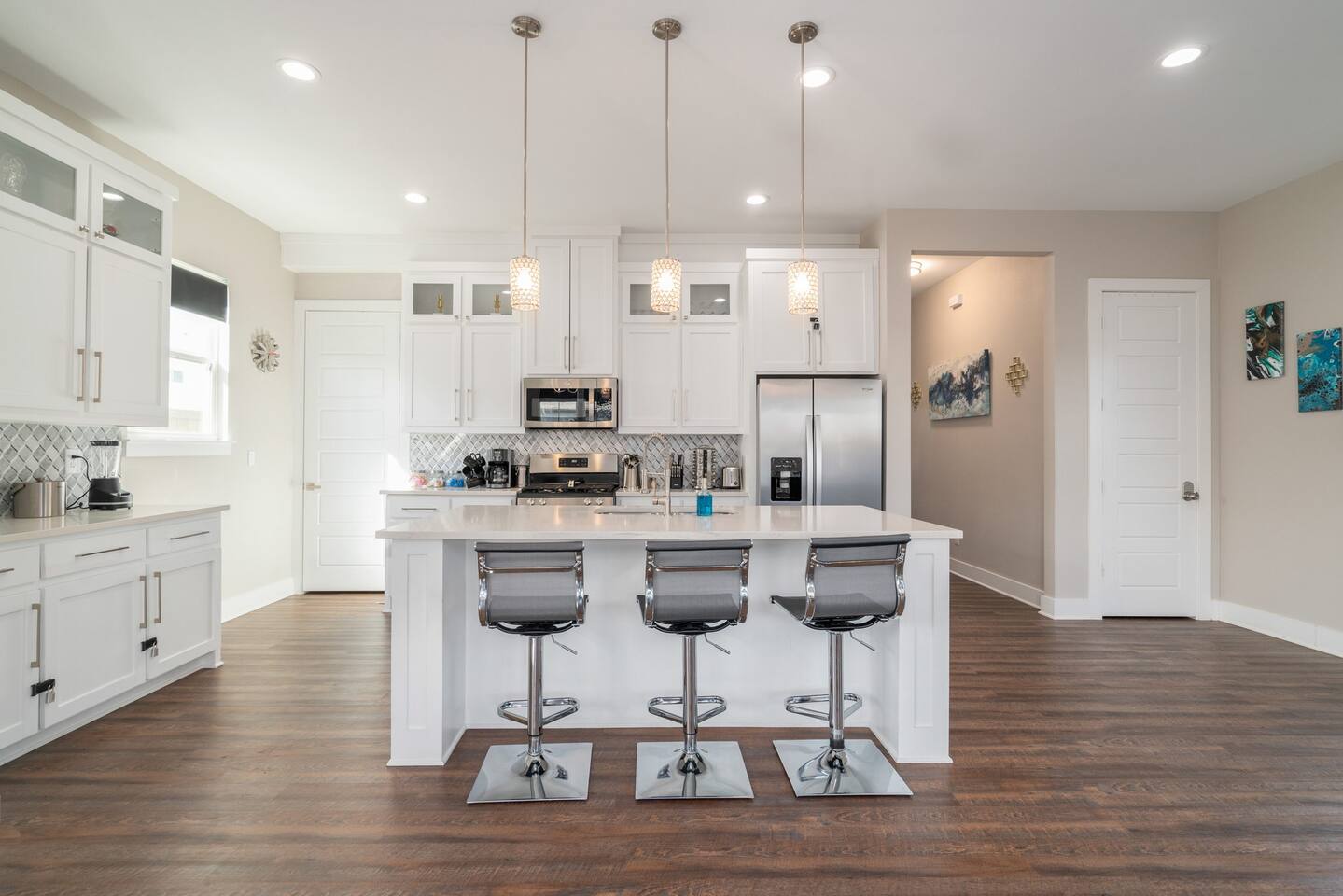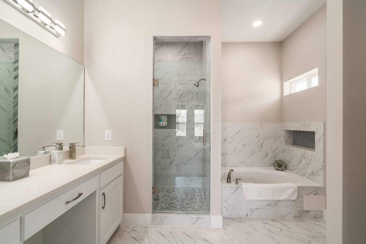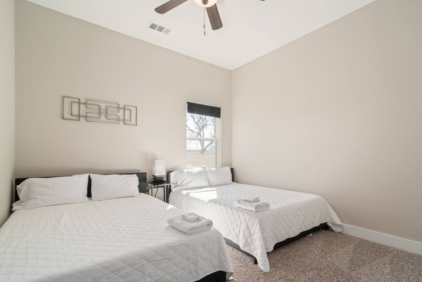 This modern home welcomes you with open arms as you enter the living room that features sleek and contemporary decor, relax in style while you catch up on the news or watch the game on the 77” HDTV above the electric fireplace and get comfy on the large leather sectional! The Art House features a fully stocked kitchen with everything an at-home chef could need to make great meals as well as a gigantic dining table that seats 12 and is made to host big feasts! The kitchen is equipped with a plethora of cooking utensils, spices, unique stoneware, and stylish silverware to compliment your celebratory dinners. There is also a second living room upstairs that includes an HDTV and a large leather sectional next to a beautiful custom accent wall. The Art House provides ample common space for your guests. Each aspect of the home was designed with intention and purpose, such as the all white towels and sheets for that hotel feel. Get a rejuvenating sleeping experience with our bedrooms that feature at least new queen size mattresses and black-out blinds. All bedrooms are located on the second story. The master bedroom contains a king size memory foam bed for a comfortable night's sleep after exploring Dallas! Our guests enjoy the mattresses so much, they inquire what mattresses we use! Grab a cup of coffee and enjoy the sunrise outside on the balcony featured in the master bedroom that has a partial skyline view of Dallas! There are three full bathrooms total and the tankless water heater provides hot water continuously to accommodate large groups getting ready at the same time. One bathroom features a combination stand-in shower/tub, the second features a spacious stand-in shower and the master bathroom features a stand-in shower and a separate jetted bathtub. The master bathroom also includes double vanity sinks and provides a great place to relax and pamper at the beginning or end of your day!